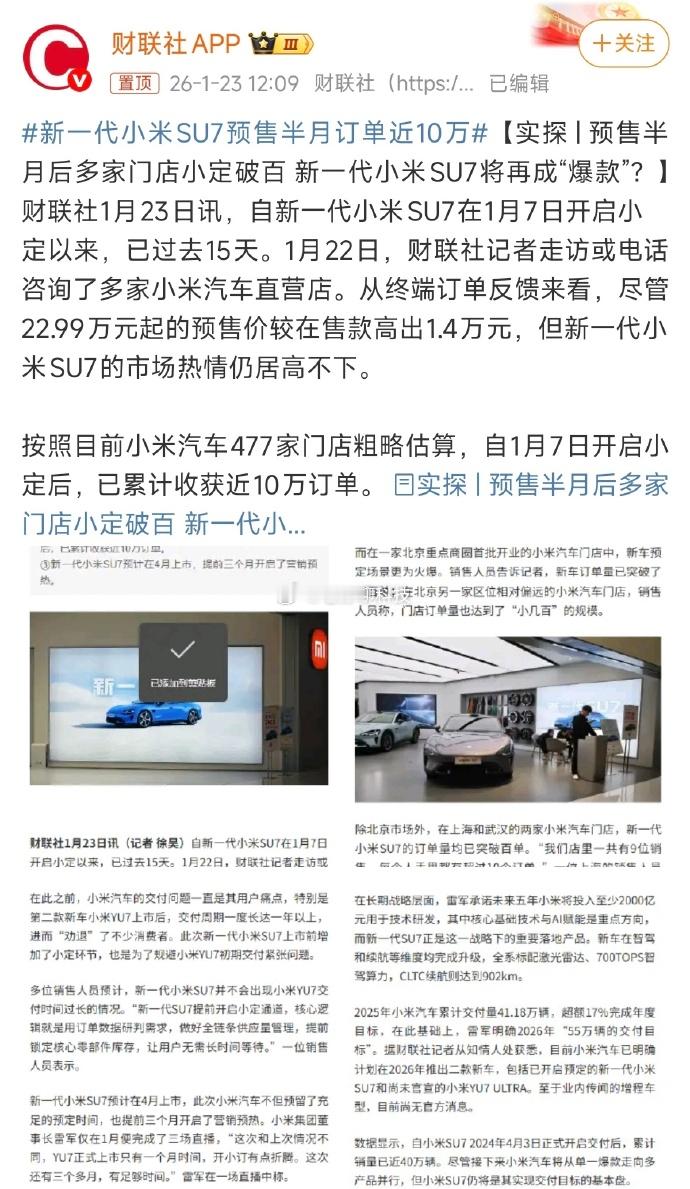 新一代小米SU7预售半月订单近10万某些人又要失望了小米SU7又卖爆了,我为什么说又?一款产品的销量不以某些人的意志为转移!天天骂小米,天天恨小米,耽误小米受欢迎!