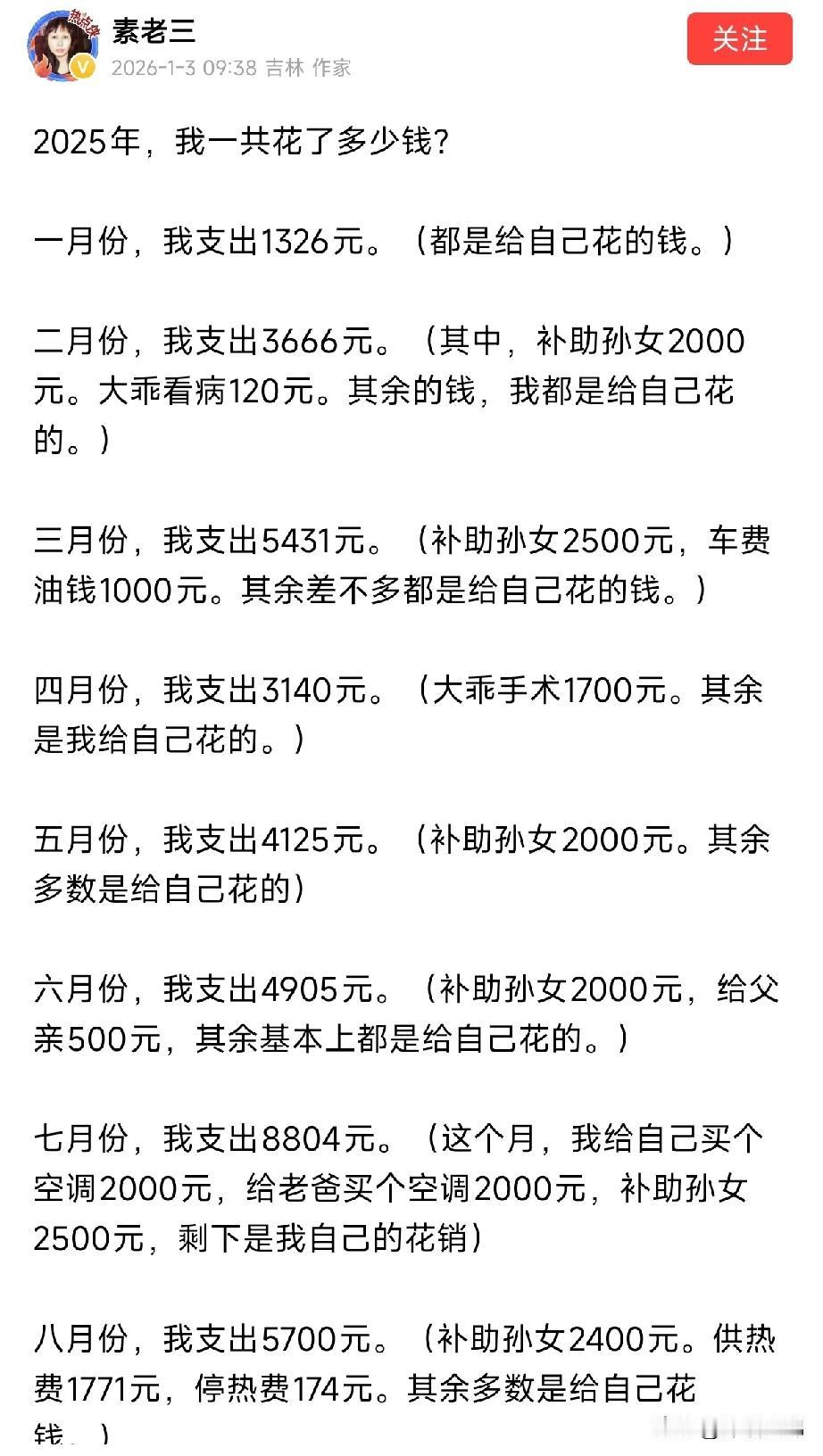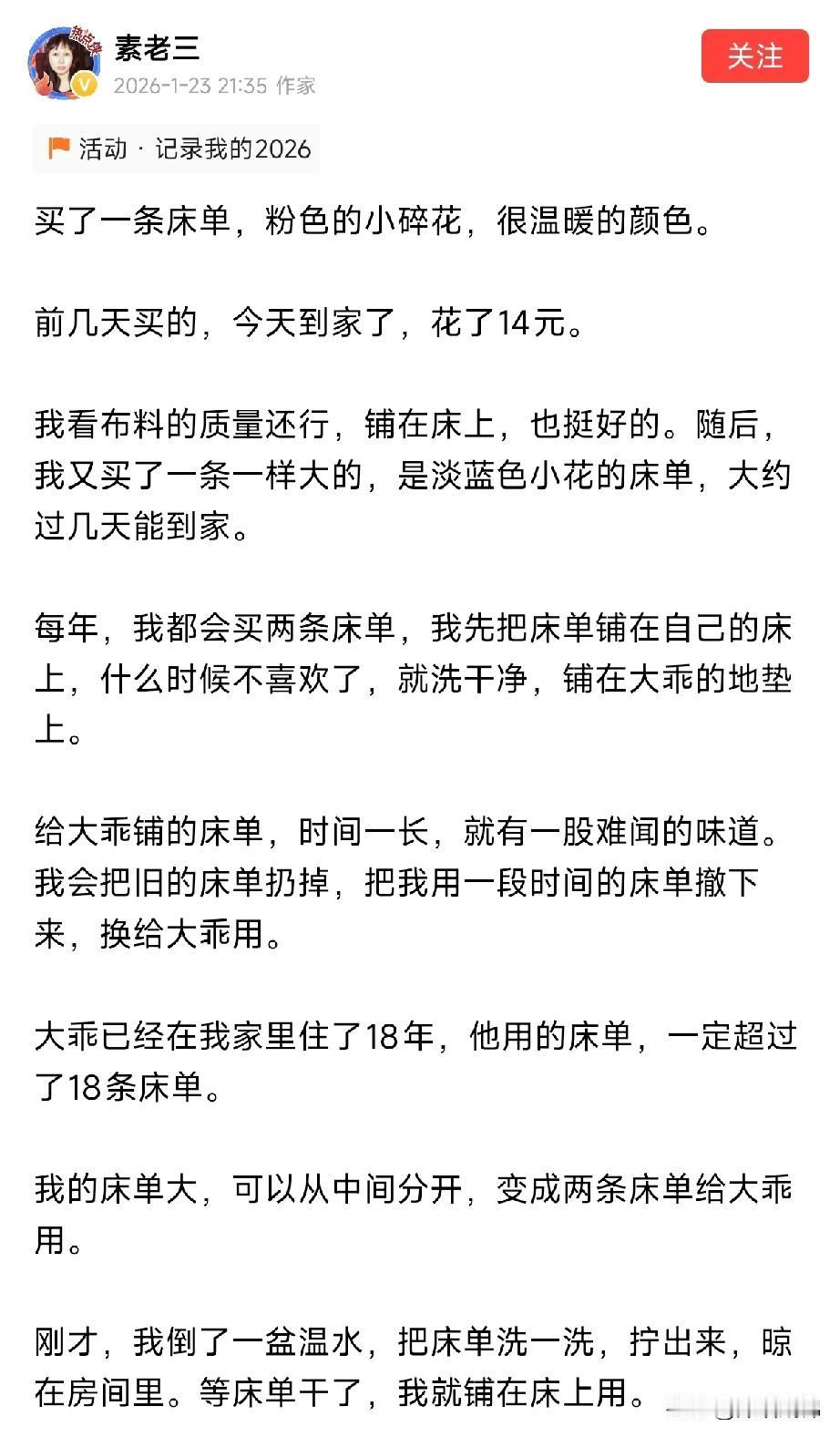 惊呆了!大名鼎鼎的头条红人、大作家素老三的生活节俭到可怕!她竟然花14块钱给自己买了一条床单,还很骄傲的炫耀一番! 以前就对素老师有所耳闻,有段时间也经常看她的文章,大部分是生活中的琐碎经历。虽然零零散散,却处处透露出她对现状的满足。 素老师退休金有1500元,一到手就存起来,攒够一万就存定期。她虽然在头条月入过万,但对生活相当节俭。 她去小餐馆吃饭,一次消费不超过10元,一年和儿子孙女父母亲朋外出吃饭的费用是6000元,还做了反思,认为这一部分花的有点大手大脚。 她的卧室,很大的空间里只见到一张床,既没有床头柜也没有台灯,床上的靠背硬邦邦。不知道热爱读书的她在睡前是怎样看书的。 她花14块钱网购了一条床单,很满意,然后又买了一条同款不同花色的。 目测她的床应该是一米五的,这么大的床,配一条14块钱的床单,这床单不知道是什材料礼做的。大概不是纯棉的吧,有人说是化纤的,用的时候噼里啪啦晚上都不用开灯了! 她也说了自己买便宜床单的原因,就是每年买两条床单换着用,不新了、脏了、有异味了就给她家狗子用,然后自己再买新的。 床单作为贴身的东西,哪怕用一天,也首先要舒适,这14块的床单和肌肤亲密接触不知道是什么感觉。 素老师虽然对自己节俭,但是会每个月给孙女2000块,给儿子交社保每年花10000。父母爱子,则为之计深远。这样的素老三,的确让人佩服!