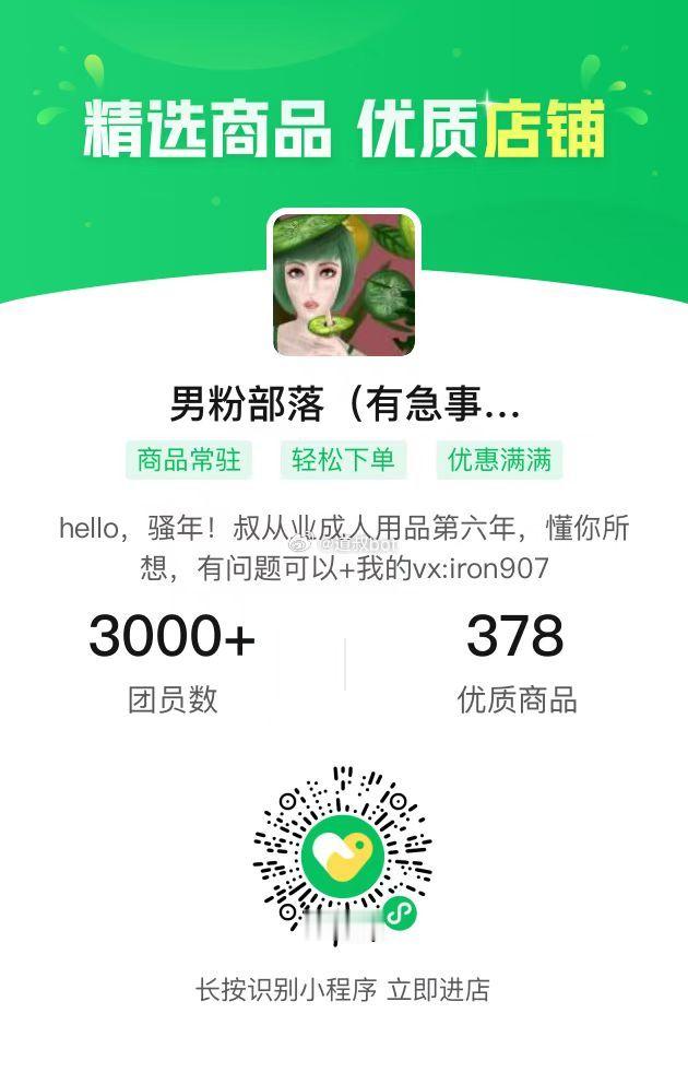 TB:男粉部落(可直接搜店铺)…………………快团团店铺,已更新300多个品种,还有私激套套,欢迎扫码下单体验……