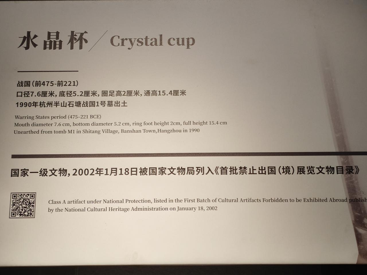 杭州博物馆镇馆之宝 水晶杯 来自于战国中晚期 国家一级文物,禁止出国展览 带定