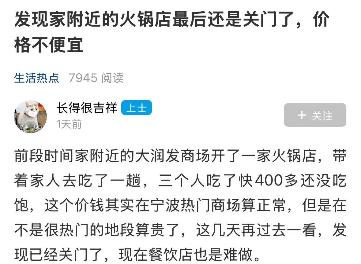 3个人400多没吃饱宁波又一火锅店关门了 最近宁波的天很冷。这种气温下,火锅成为了很多人逛街时的选择。几家欢乐几家愁,有持续火爆的,也有开始关门的。有宁波网友发帖称,自己家附近的火锅店这几天已经关门了。他还说曾经三个人吃了快400多还没吃饱,这几天过去看已经关门了,感叹生意难做这家品牌火锅店,宁波9家店已经关了4家,今年的夏季小龙虾已经不热了,没想到冬季的火锅也遭遇滑铁卢…来源:东方热线