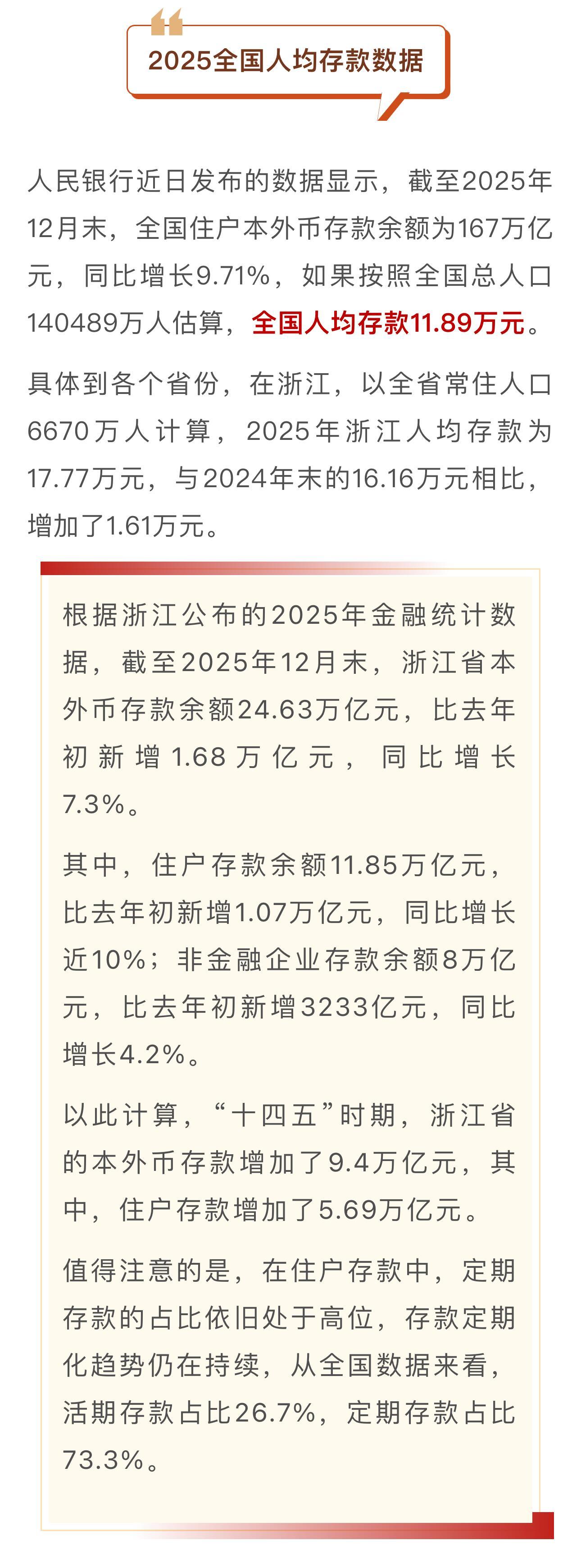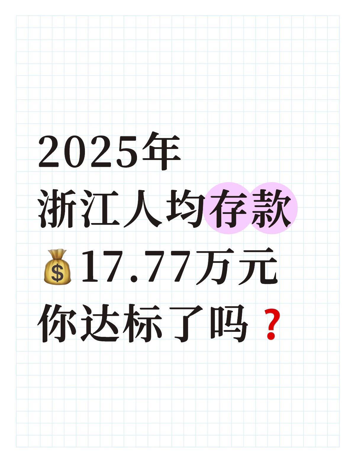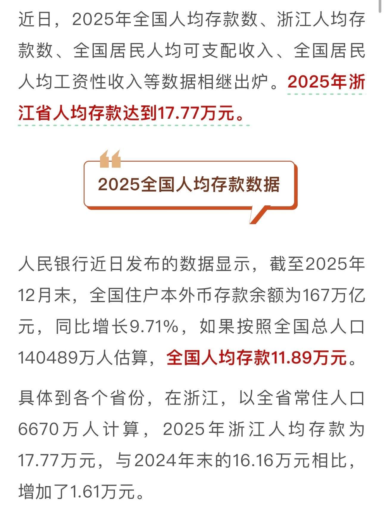 浙江人均存款超17万你达标了吗 浙江存款数据出炉💰人均17.77万,谁达标了❓浙江的宝子们快出来报到🙋🙋🙋人民银行发布存款数据👇2025年:📊全国人均存款:11.89万📊浙江人均存款:17.77万(比2024年多了1.61万!)浙江果然又跑在前面🏃♀️再看看收入数据👇全国:人均可支配收入4.3377万人均工资性收入2.4555万人均消费支出2.9476万……存款哪来的?🧐说好了一起月光是哪些浙江人背着大家偷偷存了这么多😭所以…你达标了吗?(真诚发问,不是攀比)