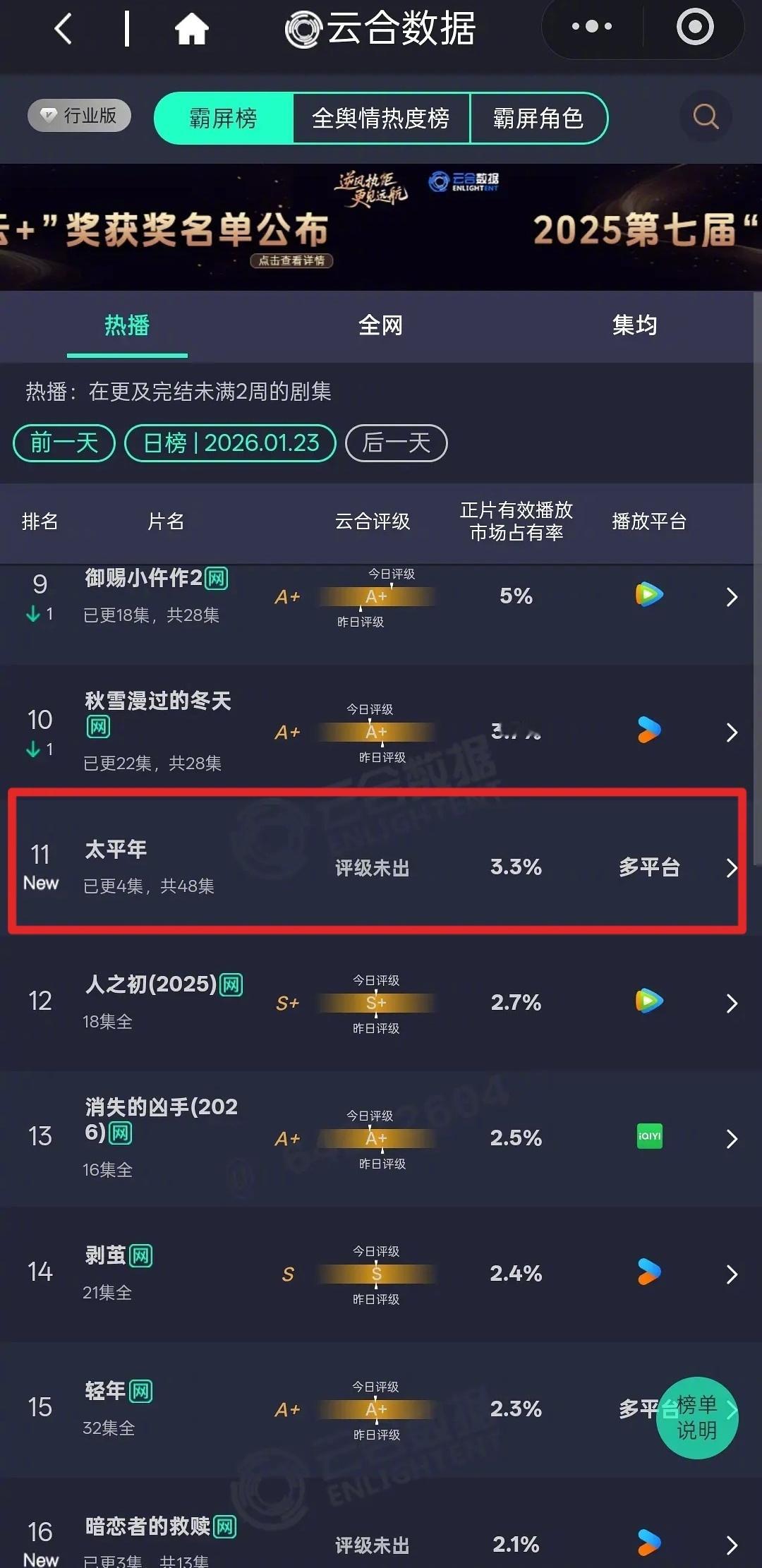 太平年这酷云实时收视率可能要创造历史了,历史最低~