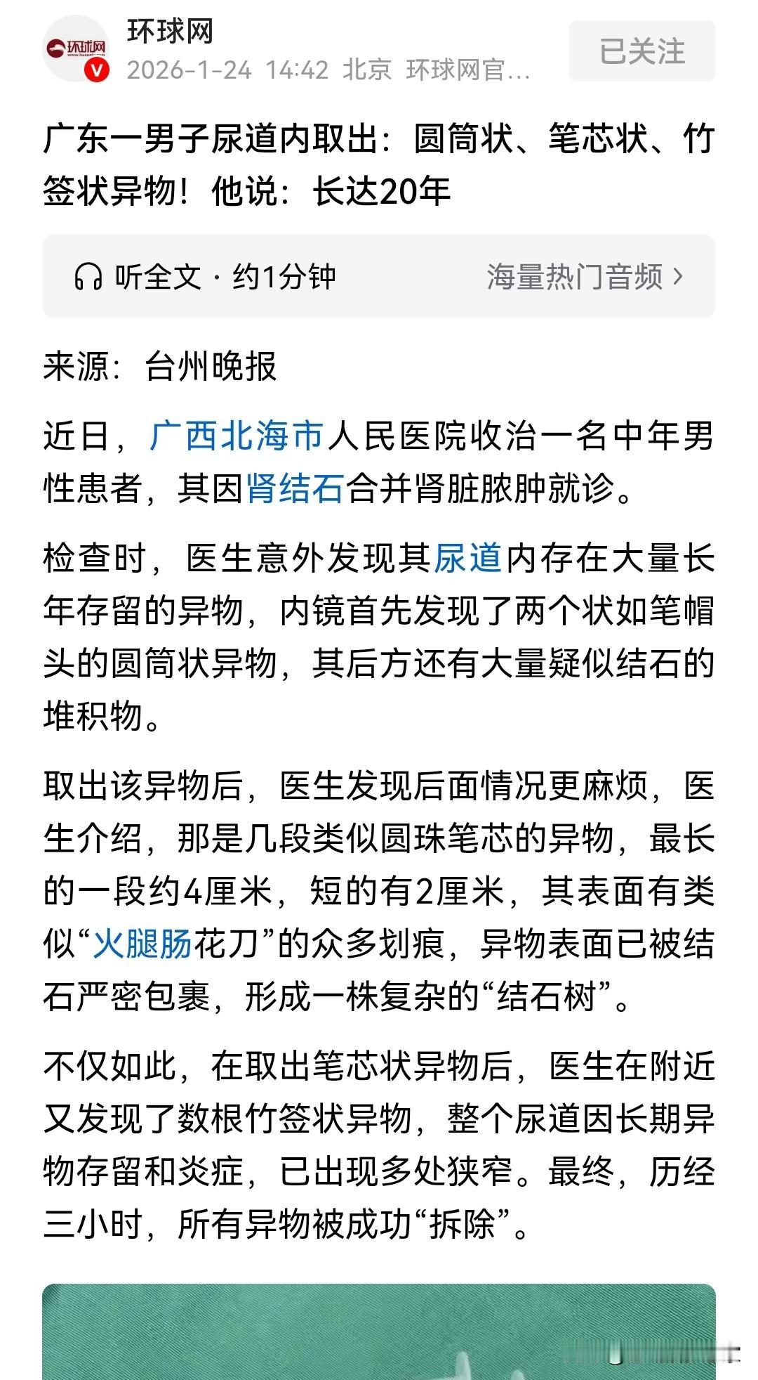 这大哥对自己是真狠!20年啊! 刷到这个新闻真是服了,刷新三观 广东一男子就医,医生从他那里掏出一堆异物! 圆筒的、笔芯的、竹签的全有,最长笔芯4厘米,还被结石裹成了结石树! 更离谱的是,这些东西在他身体里整整待了20年! 那里都发炎变窄了,硬是扛到肾结石肾脓肿才去医院,这忍耐力谁看了不懵? 医生取这些异物足足花了3小时,咱就是说,对自己也太狠了吧! 身体不舒服别硬扛,赶紧看医生才是正事啊! 离谱新闻 人类迷惑行为大赏