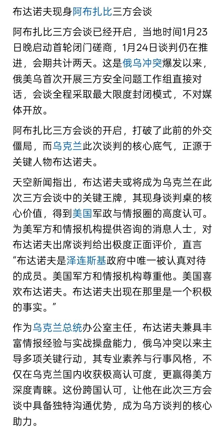 不给!拿不下? 乌克兰现总统办公室主任、刚刚卸任的前国防部情报总局局长布达诺夫,可能应该是个铁杆反俄的人物。印象中,好像记得他曾经说过,如果乌克兰在这场战争中彻底的失败,就会袭击和爆炸俄罗斯的几十家核电站。当然,我们不知道布达诺夫究竟是嘴上说说,还是早已经有准备,毕竟搞情报的人都是秘密和神秘莫测高深的。 但是,布达诺夫去参加在阿联酋首都阿布扎比的乌克兰与俄罗斯和美国的谈判,就有点出乎意料之外。因此,怀疑他此行的目的,估计就是以自己从前情报总局局长的身份和掌握的情报,当面告诉俄罗斯的代表团成员,他有真凭实据,俄罗斯的军队无论如何努力,都无法占领乌克兰的顿巴斯地区,乌克兰军队也坚定不移的不会撤离顿巴斯地区,从而让给俄罗斯。 仅此而已。