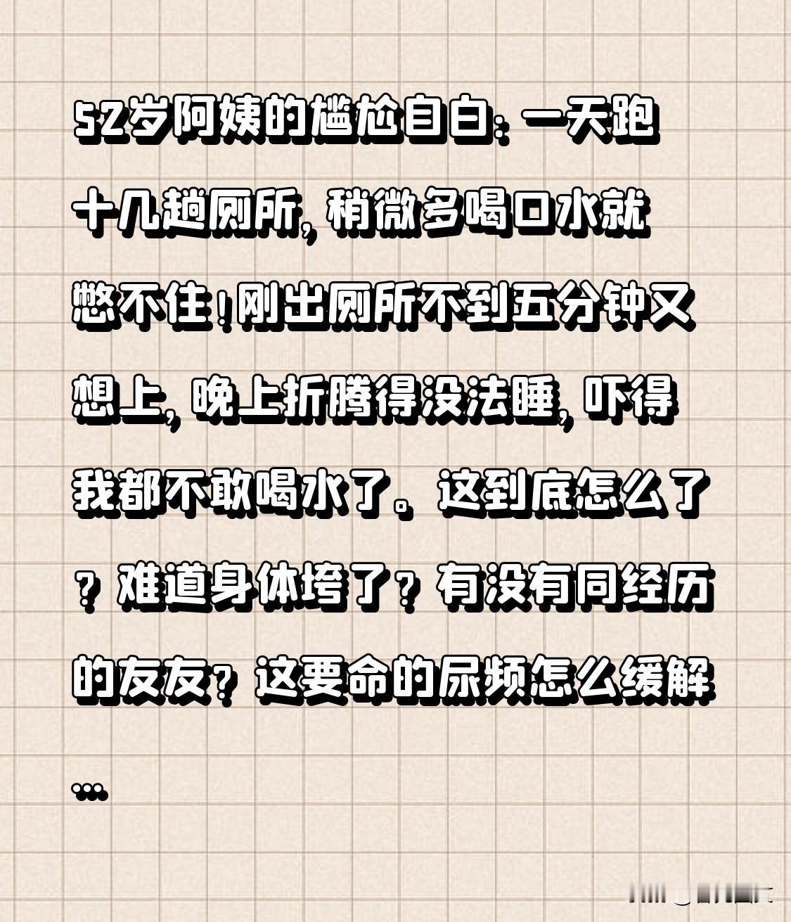 52岁阿姨的尴尬自白:一天跑十几趟厕所,稍微多喝口水就憋不住!刚出厕所不到五分钟又想上,晚上折腾得没法睡,吓得我都不敢喝水了。这到底怎么了?难道身体垮了?有没有同经历的友友?这要命的尿频怎么缓解啊?在线急求办法!