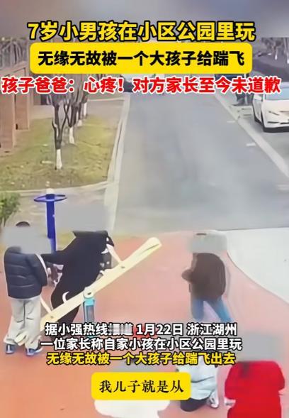 “天生坏种!”浙江,一男子见儿子迟迟不回家,便下楼寻找,结果在草丛发现儿子蹲那哭泣,身上还有个脚印。事后查监控,才得知儿子被一名六年级男孩狠狠踹飞,并且对方家长毫无歉意!网友:必须严惩! 浙江,某小区里总飘着各家饭菜的香味,老人们搬着小板凳在楼下唠嗑,小朋友们追着跑着在公园的健身区和游乐区撒欢,7岁的小宇(化名)也是这热闹里的一员。 往常这个点,只要爸妈在阳台喊一声,他就会攥着手里的玩具跑回家,可这天饭都摆上桌了,楼道里还是没传来孩子熟悉的脚步声。 小宇爸爸赶紧下楼找孩子,把平时小宇常待的地方都找了个遍,连个人影都没有,越找心里越慌,直到走到公园角落那片矮草丛旁,才听见一阵闷闷的、带着委屈的啜泣声。 走近了一看,小宇正蹲在草丛边,小小的身子缩成一团,头埋在膝盖上,后背的衣服沾着草屑和泥土,还有一个清晰的运动鞋印,格外刺眼。 小宇爸爸赶紧蹲下来,伸手摸孩子的头,刚喊了一声 “小宇”,孩子就猛地扑进他怀里,哭得撕心裂肺,肩膀一抽一抽的,连话都说不完整,只断断续续说着 “大哥哥…… 踹我…… 疼……”。 爸爸扶着孩子站起来,才发现孩子的裤腿也磨破了,看着孩子身上的伤和害怕的模样,当爹的心里像被针扎一样疼。 他一边轻轻拍着孩子的背安抚,一边追问事情的经过,可小宇被吓得够呛,只记得对方是个个子很高的大男孩,穿黑色衣服,看着比他大很多,至于为什么被踹,孩子却说不上来,只知道自己当时正好好走着,对方突然就抬脚踹了过来。 为了弄清楚事情的真相,小宇爸爸带着孩子去了小区物业中心,说明孩子在小区里被人欺负,身上出现了明显的外伤。 物业工作人员一听涉及到未成年人的人身安全,立刻启动了应急调阅监控的流程还同步联系了社区民警,全程有工作人员陪同着去监控室,调取了公园区域当天下午的监控画面。 画面中,小宇兴冲冲的跑到一个身穿红色衣服的孩子身边,跟这个红衣小伙伴聊天,不知道说了是什么,没多久小宇就准备往其他地方跑去。 经过一个坐在跷跷板上,身穿黑衣的大男孩时,对方用了十足的力气,直接一脚把小宇踹飞了出去,整个人摔在旁边的水泥地上。 物业工作人员根据监控里男孩的样貌和穿着,结合小区的住户信息,很快查到了这个男孩的身份,他今年上小学六年级,就住在同一个小区。 看着监控里的画面,小宇爸爸又气又心疼,当下就带着孩子去了附近的医院做全面检查,拍片、做彩超,一系列检查下来,发现孩子的后腰和背部有大面积的淤青,属于软组织挫伤,医生说孩子的身体损伤慢慢养就能恢复。 可更让人担心的是,孩子在经历了这件事之后,出现了明显的心理应激反应,当天晚上就不敢一个人待在房间里,看到陌生的大孩子就会下意识躲起来,连平时最喜欢去的公园都不敢靠近了。 医生叮嘱家长,近期要多陪伴孩子,多进行心理疏导,要是情况没有好转,还需要找专业的心理医生介入。 检查完回到小区,小宇爸爸根据物业提供的住址,找到了那个六年级男孩的家,敲了好几次门,男孩的妈妈才打开门,小宇爸爸强压着怒火。 把事情的经过从头到尾说了一遍,还拿出了孩子身上的伤和监控画面的截图,要求男孩和家长能给孩子一个真诚的道歉,让孩子知道做错事是需要承担后果的。 可没想到,男孩妈妈的态度格外冷淡,不仅没有丝毫歉意,还反问小宇爸爸,是不是自家孩子先招惹了她儿子,说 “小孩子之间打打闹闹很正常,至于这么上纲上线吗”。 甚至直言她的儿子不可能平白无故踹人,说完就想关门,小宇爸爸伸手想拦着继续沟通,对方却直接用力关上了门,再敲门,里面就再也没有动静了。 之后的几天,小宇爸爸又去了好几次,要么家里没人,要么开门后对方的态度依旧蛮横,始终不认为自己的孩子有错,更别说让孩子道歉了。 无奈之下,小宇爸爸报了警,民警接到报警后,很快上门进行调解,可即便在民警面前,男孩的家长依旧百般推脱,只是口头敷衍着说 “会教育孩子”,却始终不肯让男孩出来给小宇道歉。 小宇爸爸说,他从始至终都没想过要什么经济赔偿,那些检查费花不了多少钱,他只是想要一个道歉,一个对孩子的交代。 有人把这件事的监控视频和经过发到了网上,很快就引起了全网网友的关注。 有网友表示,这根本不是小孩子之间的玩闹,而是单方面的恶意人身攻击,一个六年级孩子,已经有了基本的是非观,不可能不知道随意踹人会造成什么样的后果。 对孩子的教育,不仅要教他们知识,更要教他们明辨是非,懂得尊重他人,而家长作为孩子的第一任老师,更要做好榜样,承担起监护的责任,不要让 “他还是个孩子”,成为孩子肆意犯错的挡箭牌。 对于这件事,您有什么想说的吗?欢迎评论区留言讨论。 信源:浙江少儿频道2026-01-23——《7岁小男孩在小区公园里玩无缘无故被一个大孩子给踹飞》
