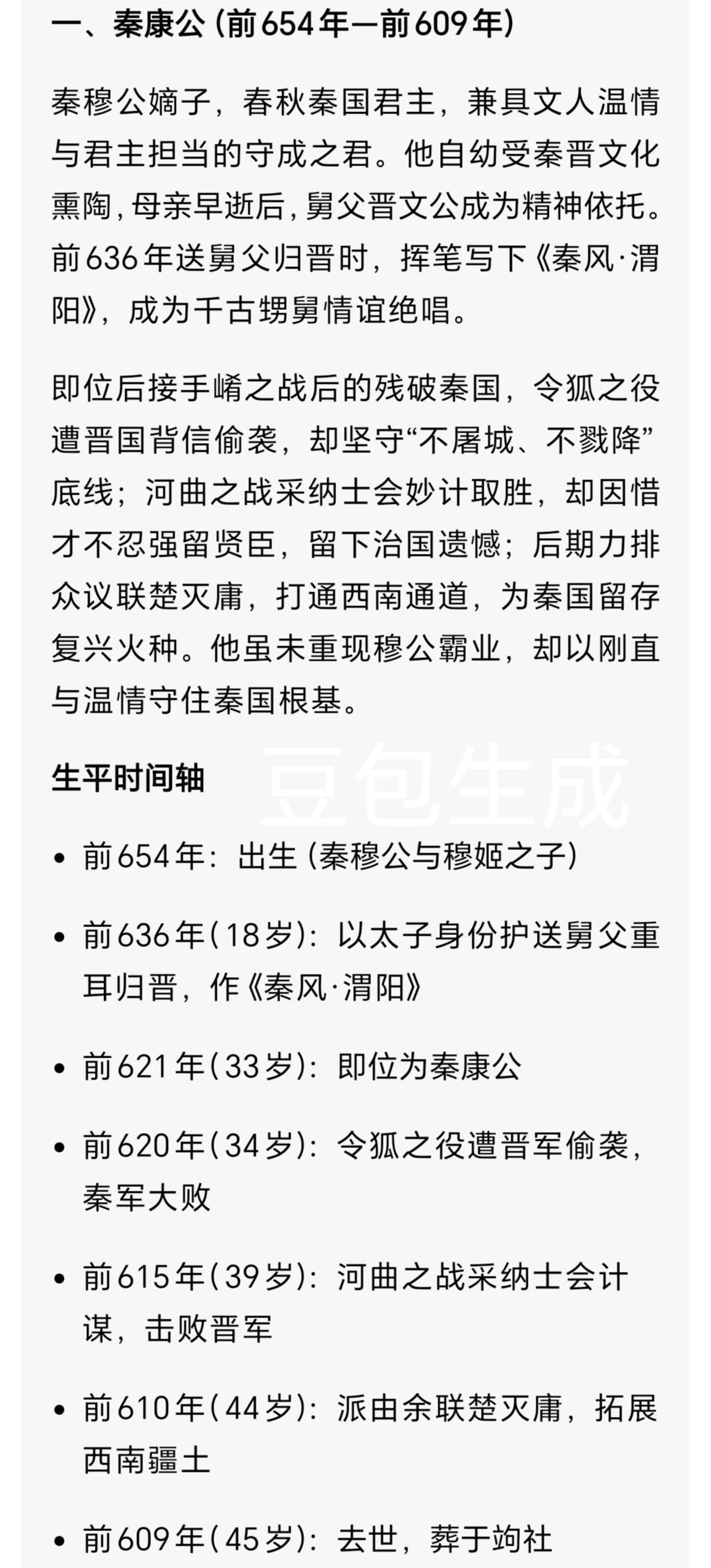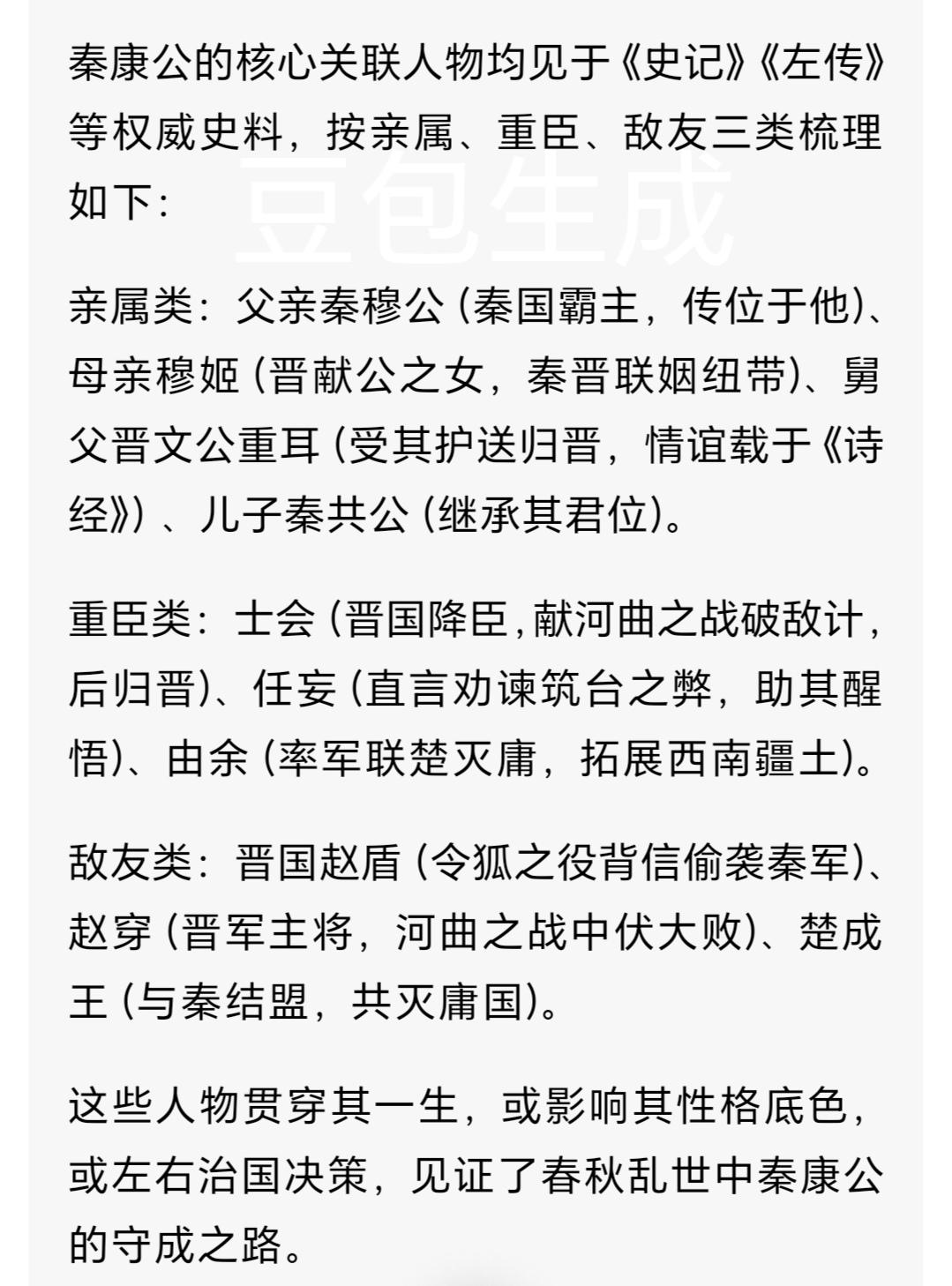 秦康公:诗藏柔情遇背叛,春秋守成君的乱世坚守 一、渭水送别,诗藏千年温情 公元前636年渭水之滨,秋风卷着芦苇絮轻舞,太子罃(yīng)身着玄端礼服,指尖摩挲着琼瑰玉佩的纹路,目送舅父重耳的马车扬尘远去。这位秦穆公与穆姬的嫡子,自幼浸在秦晋礼乐交融的氛围中,母亲早逝后,舅父便是他最亲的依靠。他挥笔写下《秦风·渭阳》,“何以赠之,路车乘黄”的后续诗句,更显情谊厚重。这首收录于《诗经》的名篇,藏着他温润底色,却终将在权力博弈中历经淬炼。 二、令狐之役,刚直遇挫识人心 公元前621年,太子罃即位为秦康公。彼时秦国经崤之战国力凋敝,晋国赵盾遣使赴秦,恳切邀秦护送公子雍继位。秦康公念及甥舅旧情,更盼两国重修盟好,当即派重兵出征。可行至令狐,深夜突然鼓声震天——赵盾改立幼主后突袭秦军,营帐被火光吞噬,士兵的呼救声与刀剑声交织。《左传》载“秦师夜遁”,满心期待的同盟化为泡影,秦康公紧握双拳,终于悟透乱世规则。次年伐晋夺武城,他仍坚守“不屠城、不戮降”,守住君主底线。 三、河曲之胜,用人留憾显胸襟 公元前615年河曲之战,晋军兵力占优、地形熟悉,秦军陷入被动。投奔秦国的晋臣士会献妙计:“三百战车拖枝扬尘,佯装溃散诱敌。”秦康公当即采纳,赵穿果然孤军追击,落入埋伏。庆功宴上,他亲为士会斟酒,允许其保留晋国衣冠礼仪,尽显惜才之心。可好景不长,晋国用“魏寿余诈降”之计诱士会归国,秦康公识破计谋却不忍强留,亲手递上酒爵送别,《史记》载其叹“子之归,晋必治矣”,这份遗憾成了治国路上的一道印记。 四、筑台自省,蜕变沉稳统治者 在位中期,秦康公欲在雍城筑观景高台,既能俯瞰都城,又能遥望东方晋国。工程征调大量民力,导致关中农忙缺人,百姓怨声载道。大臣任妄冒死劝谏,恰逢楚使来访,言语间频频打探民力、粮草,神色狡黠。深夜,秦康公站在未完工的高台上,望着城中稀疏灯火,耳边似有百姓低语,猛然醒悟:“高台再高,不及民心安稳。”当即下令停工归农,将民力投入农耕与边防,化解了潜在危机。 五、联楚灭庸,留存复兴火种 公元前610年,楚国遭庸国叛乱求援,秦国东有晋国封锁、西有西戎侵扰,大臣多主张观望。秦康公力排众议:“结楚破庸,既解西顾之忧,又拓西南通道。”他派名将由余率军出征,由余巧用西戎战法绕后奇袭,庸军首尾不能相顾,很快城破。此战不仅帮楚国平叛,更让秦国夺得铜矿产地与粮食产区——铜矿支撑兵器铸造,粮区缓解关中饥荒,《左传》称“秦得西南之地,国力稍振”。 公元前609年,秦康公去世,在位12年。他接手的是崤之战后的残破秦国,虽未重现穆公霸业,却以刚直与温情守住根基。他没有霸主的铁血,却有人性的温度;没有开拓之勇,却有守成之智,堪称春秋乱世诸侯的真实缩影。 你觉得秦康公的温情是软肋还是光辉?若强留士会,秦晋格局会改写吗?评论区聊聊!东周列国志 秦穆公之子 秦康公