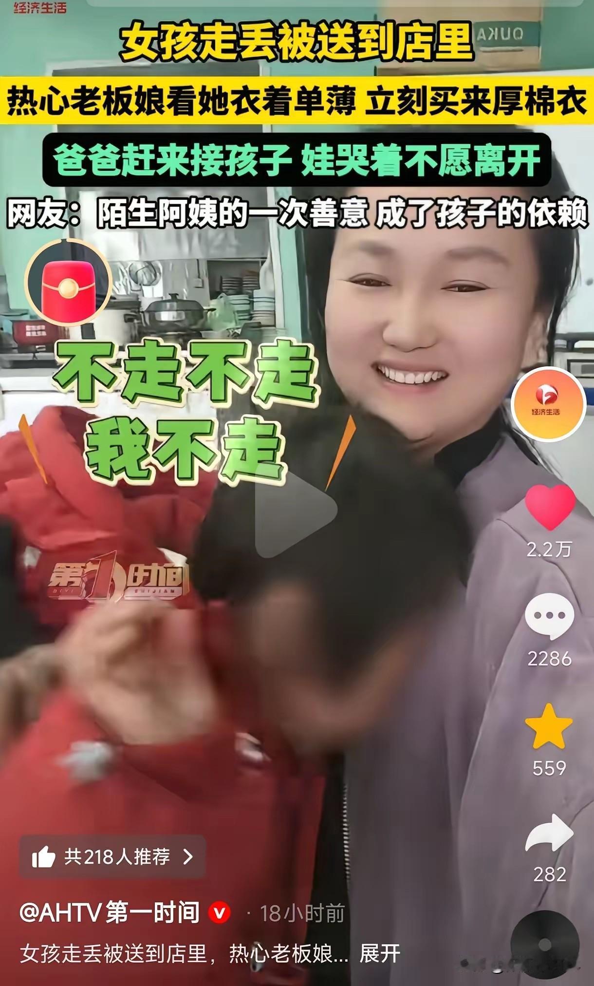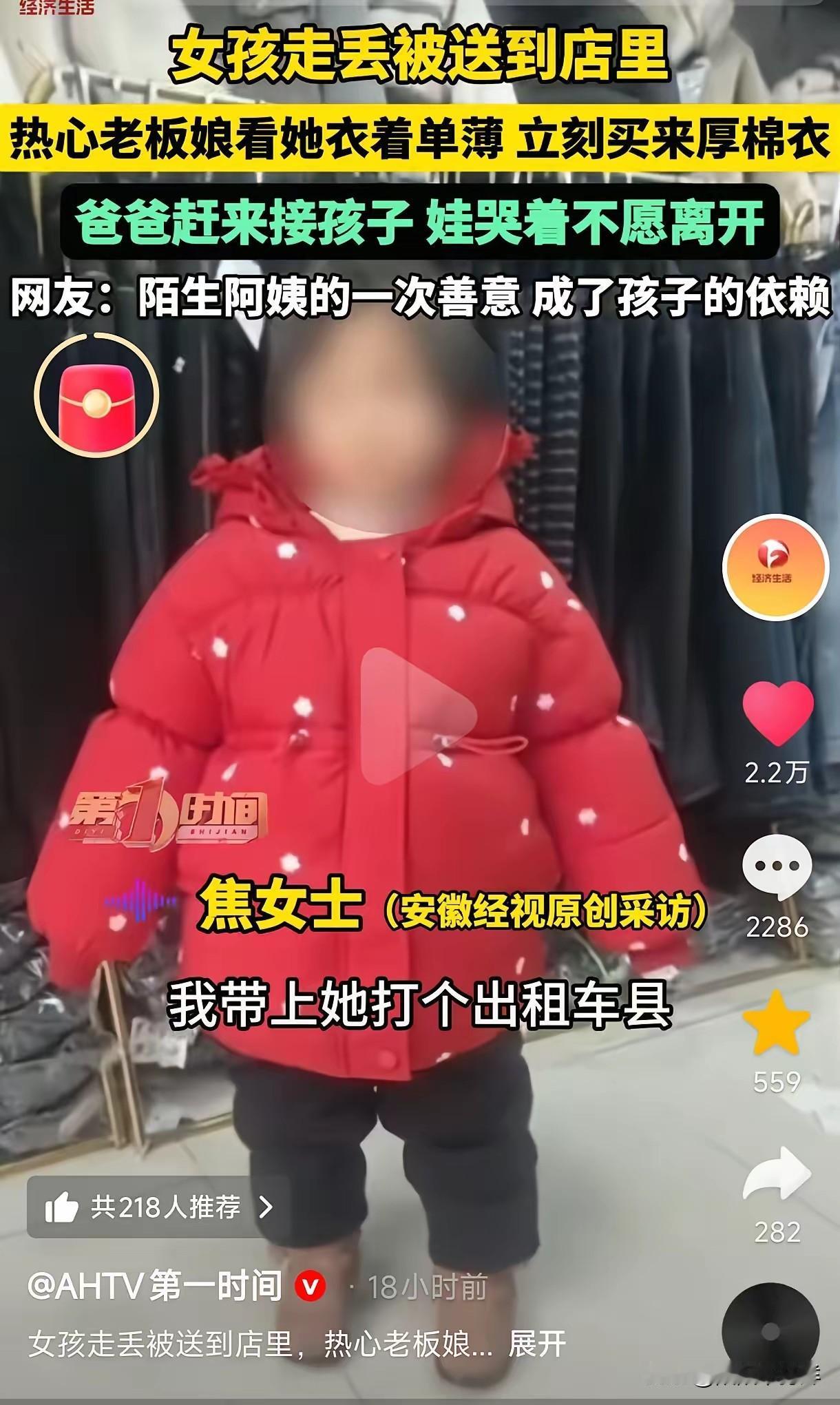 河南,一位小女孩走丢被送进店里,老板娘见她衣服又脏又薄,二话没说给她买了厚棉衣,带她吃热乎乎的饭菜。之后孩子父亲找来,小女孩竟哭闹着不愿回家,一个劲往老板娘怀里钻,直至第三次找来才回了家。网友:她是从老板娘身上感受到了妈妈的温暖。 (来源:AHTV第一时间) 这件事在网上传开后,评论区直接炸了锅。有人说这是今年冬天最暖的瓜,也有人忍不住替孩子心疼。一件红色的厚棉衣,一碗热乎的饭菜,就能让一个孩子把陌生阿姨当成全世界最亲的人。这哪是依赖,分明是孩子心里缺爱的信号。 老板娘焦女士接受采访时说,孩子刚被送进来的时候,缩在墙角一句话不说。小手冻得通红,身上的旧毛衣又薄又脏,沾着不少尘土。她没多想,直接去隔壁童装店挑了件最厚的羽绒服。给孩子穿上的时候,小家伙眼睛亮了一下,还偷偷摸了摸衣服上的绒毛。 中午饭点,焦女士给孩子盛了碗烩面,加了满满一勺羊肉。孩子吃得鼻子尖冒汗,嘴里还嘟囔着“阿姨做的饭比爸爸做的香”。就这么几个小时的相处,孩子彻底黏上了她。 第一次孩子爸爸找来的时候,孩子抱着焦女士的腰哭,喊着“不走不走我不走”。爸爸尴尬得满脸通红,只能先回去。第二次来,孩子还是躲在焦女士身后,怎么劝都不动。直到第三次,焦女士蹲下来哄了好久,说“阿姨以后还能见到,爸爸才是天天陪着你的人”,孩子才勉强牵了爸爸的手。 有网友说,这孩子肯定平时缺少陪伴。不然不会对陌生人的善意这么依赖。也有人质疑,家长是不是太粗心,大冬天让孩子穿这么薄就出门。还有人扒出类似的新闻,说之前也有走丢的孩子被好心人收留,最后家长上门感谢的。 我倒觉得,这事儿不能只怪家长。现在很多家庭都是爸爸在外打工,妈妈忙着做家务,孩子一天到晚见不到大人的面。他们对“温暖”的感知,比成年人要敏感得多。一件棉衣,一顿热饭,就能让他们认定这个人是“自己人”。 焦女士的善良值得点赞,但更该引起反思的是,我们到底该给孩子什么样的陪伴。物质满足永远替代不了精神上的温暖。孩子的哭闹,其实是在说“我想要被爱”。这个冬天,比棉衣更暖的,是有人愿意蹲下来,认真听孩子说句话。 各位读者你们怎么看?欢迎在评论区讨论。