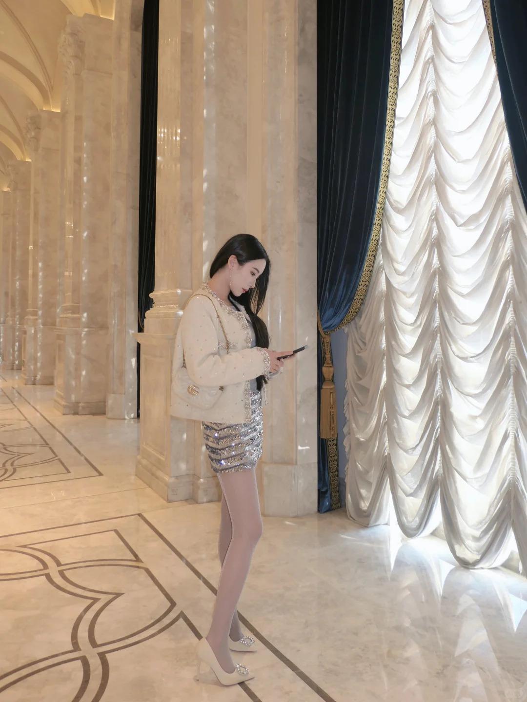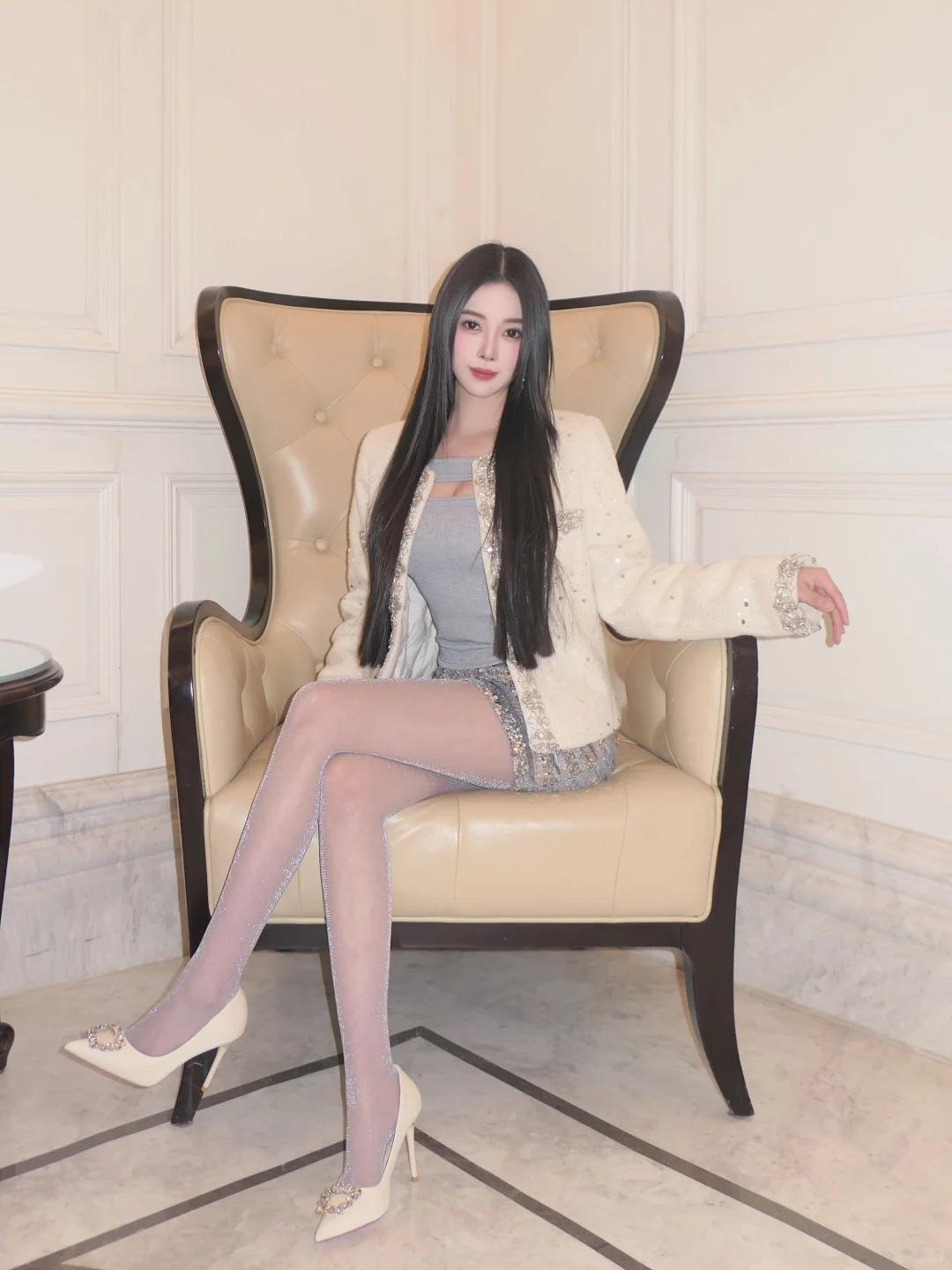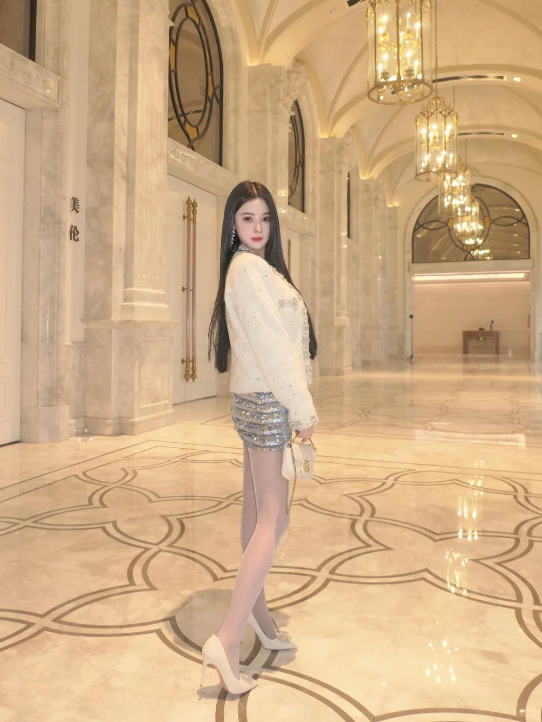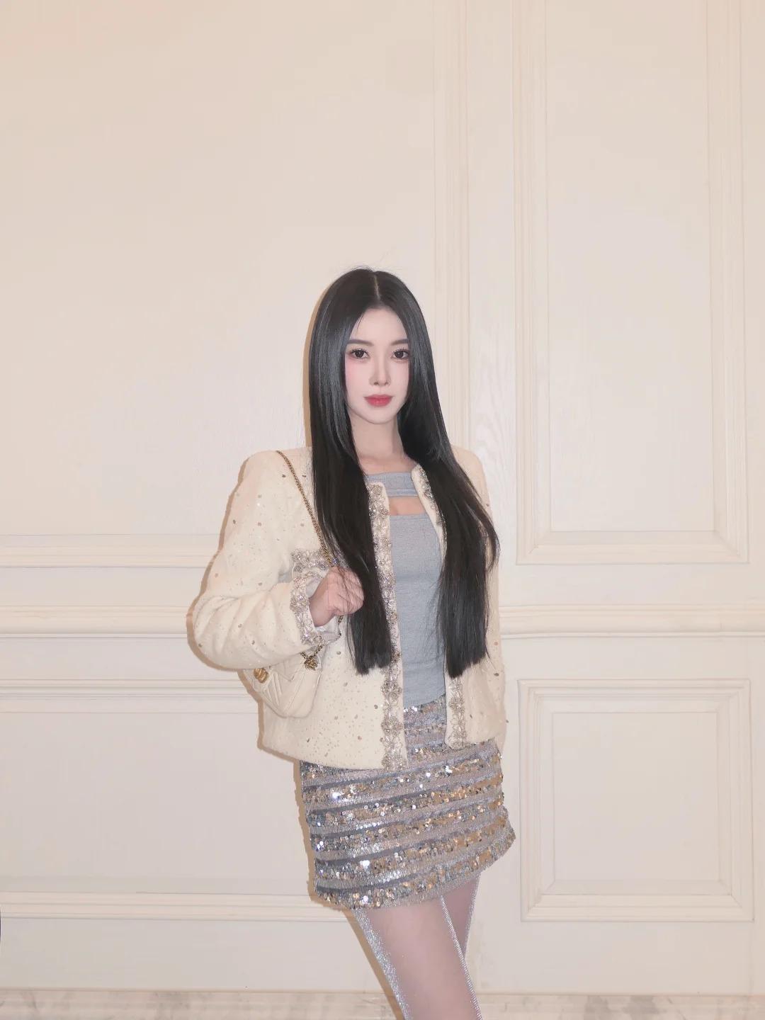 这套灰白二色穿搭将简约与灵动完美融合,尽显小清新气质。白色亮片小香风外套是视觉焦点,细碎亮片随动作流转微光,不张扬却足够吸睛,精致版型勾勒温柔体态。内搭灰色修身款,叠搭灰色珠光丝质单品,细腻珠光与亮片形成巧妙呼应,层次丰富又不失通透感。脚下白色带扣鞋简约大气,利落线条平衡了亮片的华丽感,鞋身细节与上衣亮片、珠光元素暗藏呼应。整体造型干净雅致,bulingbuling的光泽感恰到好处,甜而不腻,日常出街或约会都适配。