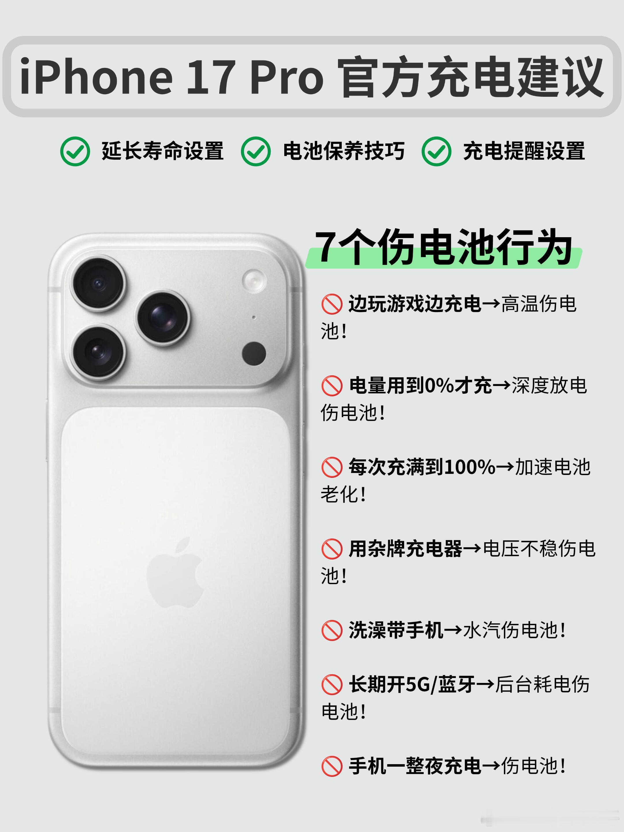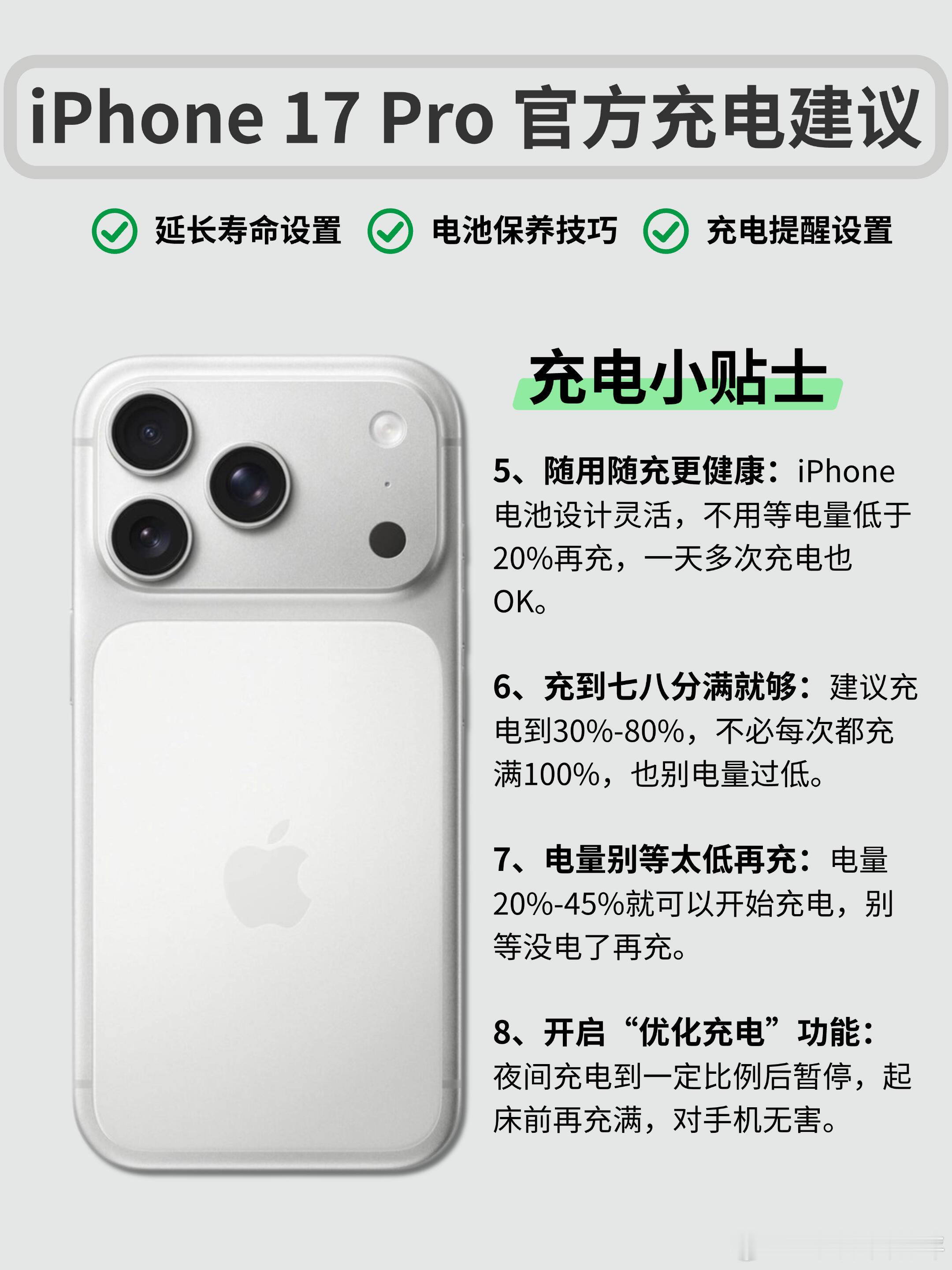 iPhone17官方电池充电建议苹果官方电池充电建议🔋让iPhone多用三年宝子们的iPhone 17都到手了吗?很多人和我说都有五六年的长期使用iPhone计划,但是不知道怎么充电来保养电池,别担心,今天小玉子整理了Apple官方+实测有效的电池保养技巧,学会了让你的爱机电池“长寿”翻倍!