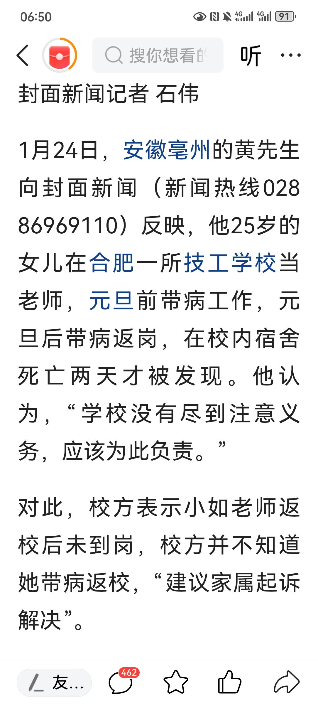痛心!25岁女教师带病返岗,宿舍离世2天才被发现 我在基层工作多年,见过太多普通人的无奈,今天看到这则新闻,心里堵得慌。 25岁的年轻女教师小如,为了不耽误学生课程,元旦前带病坚持工作,元旦后又强撑着返岗,最终在学校宿舍里悄然离世,直到两天后才被发现。这样的悲剧,不该只成为一则冰冷的新闻。 一、“放不下学生”的执念,成了压垮她的最后一根稻草 小如老师是亳州人,在合肥当代技工学校当班主任。元旦前,她已经出现身体不适,但临近期末,班里事务繁杂,她怕请假耽误学生复习,就一直硬扛着。 1月5日,她实在撑不住去了医院,医生明确建议她卧床休息。 可她只在家休息了一天,就又返回了学校。她跟家人说“学生快考试了,我不在不放心”,这份对学生的责任心,最终让她把自己的健康放在了最后。 谁能想到,1月8日晚她在宿舍离世后,直到10日才被寻找她的学生发现,法医鉴定显示,她的死亡时间正是返校后的第二天。 二、校方“建议起诉”的回应,寒了多少基层教师的心 面对家属的质疑,校方的回应显得格外冷漠:“小如返校后未到岗,我们不知道她带病返校,建议家属起诉解决。” 这句话背后,是对基层教职工权益的漠视。作为住校的教职工,学校本应建立基本的考勤和健康监测机制。 一个班主任连续两天未到岗,没有同事询问,没有领导核实,这样的管理漏洞,难道不该被问责吗?更让人寒心的是,校方始终回避“安全保障义务”的问题,用“建议起诉”四个字,把所有责任推给了法律,也推给了悲痛的家属。 三、基层教师的“不敢请假”,该被看见和改变 这起悲剧不是个例。在很多基层学校,尤其是班主任,几乎是“连轴转”的状态。 他们要管教学、管纪律、管学生心理,还要应对各种检查和评比。请假意味着工作无人接手,意味着学生进度受影响,更可能被贴上“不负责任”的标签。 小如老师的故事,撕开了基层教师权益保障的缺口。 我们需要追问:学校是否该建立更完善的教职工健康预警机制?当教师带病坚持工作时,学校有没有及时干预的制度?基层教育工作者的“不敢请假”,何时才能真正被重视和改变? 作家路遥说过:“只有不丧失普通劳动者的感觉,我们才有可能把握社会历史进程的主流。” 小如老师就是这样一位普通的基层劳动者,她用生命践行了对学生的责任,却没能等来应有的关怀。 希望这起悲剧能唤醒更多人的关注,让基层教师的权益不再是一句空话。 也愿所有在岗位上硬扛的人,都能听见这句话:你的健康,比任何工作都重要。 你身边有过带病坚持工作的经历吗?你认为学校该为这起事件负责吗?欢迎在评论区说说你的看法。 (内容取材网络) 点亮〔收藏和赞〕让健康和爱都流向你