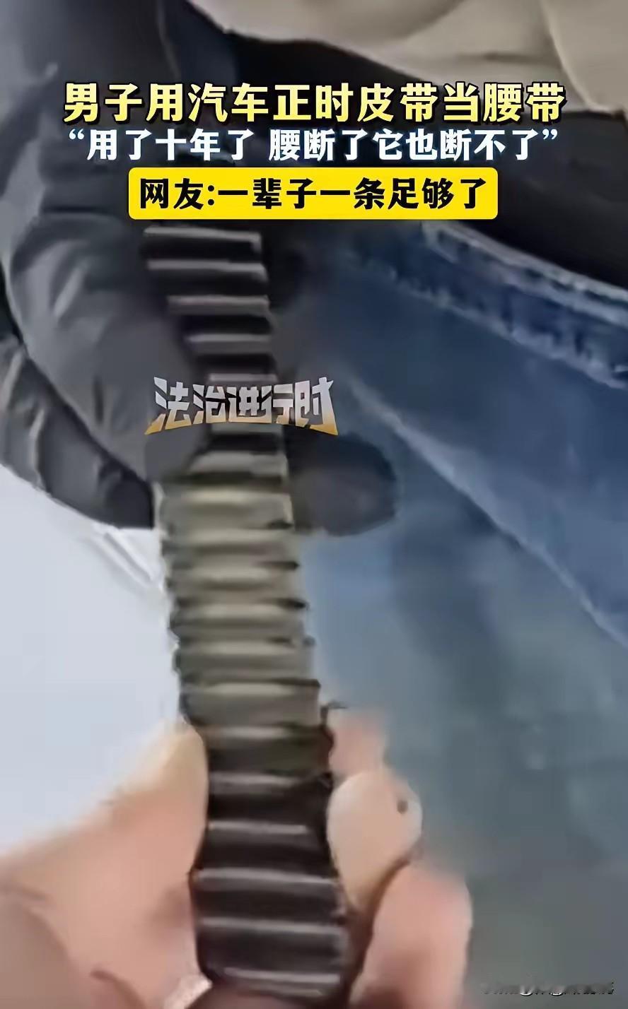 这也太有才了!山东,一男子去汽修厂修车,偶然看到维修工的腰带很特别,便上前询问他这是在哪买的腰带,没想到大哥却说:这是汽车正时皮带,用十几年了,腰断了它也断不了!网友:我咋没想到呢! 1月21日,山东这段视频在网络热传。画面里的大哥是当地一名汽修工,干这行已经二十多年。 他这条腰带,是十年前从报废车上换下来的正时皮带。当时看着扔了可惜,就剪短配了个普通扣头,系上试试。 正时皮带是汽车发动机的核心部件,出厂要扛住几十万次拉伸。大哥说,这皮带不怕刮拽,搬零件、钻车底随便造。 十年间,他换过三双劳保鞋、四条牛仔裤,腰带却没换过。冬天冻不硬,夏天晒不裂,比几十块买的皮带靠谱得多。 视频发出后,网友评论炸开锅。有人调侃以后买皮带直接去汽修厂,有人说这是汽修人的专属浪漫。 也有人质疑齿状设计会不会硌得慌。大哥笑着回应,习惯就好,还能顺便给腰部“按摩”。 这事看着好笑,实则是老技工的生活智慧。很多人觉得修车又脏又累,大哥却把旧零件变成了日常用品。 这种把专业技能用到生活里的巧思,比单纯省钱更有意义。就像厨师用剩料做创意菜,程序员用代码给孩子做玩具。 反观现在很多商品,一味追求颜值和营销,却忽略了耐用性。这条腰带没有logo、没有设计,却用十年证明了品质。 不过,正时皮带当腰带并不适合所有人。它的宽度和硬度,对普通人来说可能不太友好。 但这种变废为宝的思路值得借鉴。生活里很多看似没用的东西,换个场景就能发挥价值。 近期,不少网友晒出自己的“硬核改造”,比如用轮胎做脚垫、用机油桶当凳子。这种接地气的智慧,正在网上引发共鸣。 有人说,这是普通人对抗消费主义的方式。不盲目追求品牌,只看重实用。这种生活态度,值得点赞。 也有人担心,正时皮带老化后会断裂。大哥表示,他每年都会检查皮带状态,发现裂纹就及时更换。 安全永远是第一位的。改造可以有,但不能拿自己的安全开玩笑。 各位读者你们怎么看?欢迎在评论区讨论。