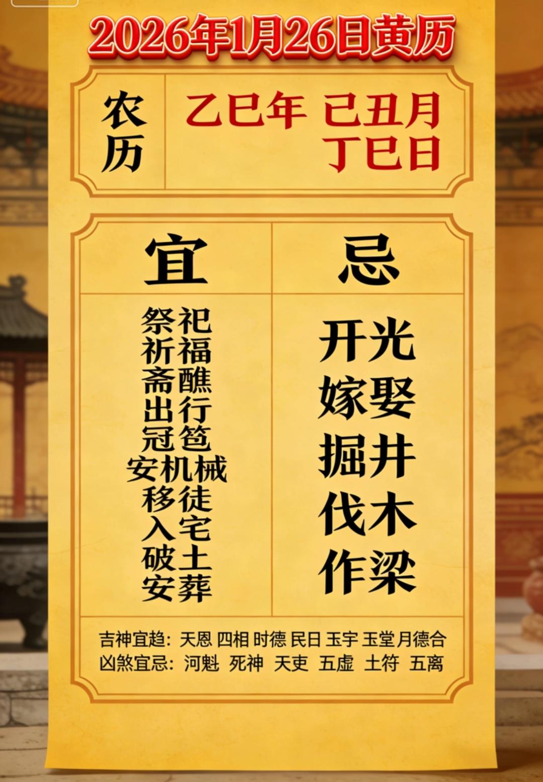 2026年1月26日老黄历白话幽默解读(腊月初八·周一)每日老黄历 择吉日历 黄历忌宜 新年必备老黄历 家用老黄历 推日干支 乙巳蛇年日历 --- 1. 日子概况 老话说:“腊八祭灶,年下来到。”今天正好是腊八节,喝粥的日子!黄历上写着: · 宜:搬家、开业、动土、祈福……好日子扎堆,适合干大事儿! · 忌:词讼、破土。意思是别吵架(腊月吵架年根不宁),也别乱挖坑(小心挖到“年终奖陷阱”)。 --- 2. 生肖冲煞 · 猴宝宝们注意:今天“冲猴”,属猴的宜静不宜动,少折腾。 老话调侃:“猴儿冲,易懵圈;喝碗粥,保平安。” · 幸运生肖:鼠、龙、蛇——今天运势如腊八粥,料多味足! --- 3. 吉时吉位 · 最佳出门时间:上午9点—11点(巳时),老话说“腊八出门早,财神跟着跑”。 · 财神位在西南:想蹭财运的,往西南方挪挪工位,或者对着西南喝粥也行! --- 4. 趣味禁忌 · 忌词讼:年底了,工作群里的口水战能免则免,否则容易“喝粥烫嘴”。 · 宜祈福:腊八本是佛教节日,今天许愿据说效果加倍!比如:“粥到福到,老板红包别不到!” --- 5. 天气彩蛋 老黄历没写天气预报,但腊八俗语说: “腊八晴,冻死山林;腊八阴,谷米成金。” 要是今天阴天,恭喜,明年粮食可能涨价……记得多囤几袋米! --- 总结: 腊八遇上黄道吉日,宜喝粥搬家搞事业,忌吵架挖坑怼领导。属猴的捧稳粥碗,西南方埋点小愿望,过年红包说不定能翻番! 附送腊八老话: “腊八粥,喝几天,哩哩啦啦二十三。” ——今天喝粥留一口,黏住好运过年不走丢! (仅供参考,生活还是您说了算~)