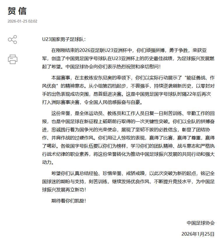 嫡长子啊!一个亚军,两封贺信。 1月25日凌晨,中国U23男足在亚洲杯决赛被日本队大灌4球,屈居亚军。 当然,这是中国男子足球国字号球队多年来的最好成绩。 但当下面的这两封贺信出现时,相信很多球迷还是没有想到吧,毕竟只是一个亚洲亚军,毕竟决赛输了4球。其他项目,拿到世锦赛冠军也享受不到这样的待遇啊。 这就是男足啊,中国体育的嫡长子,集万千宠爱于一身,然而,却是被惯坏了的那个。 个人以为,只是国家号上下功夫是搞不好中国足球的,但如果把苏超、湘超、赣超等省级联赛红红火火地搞上10年,再组织全国的冠军联赛,大学生联赛,中国足球很容易就会一飞冲天。 很多人说,省级联赛跟国家队没关系,这是大错特错的。只要省级联赛红红火火搞10年,中国的足球人口会增长10倍,当足球踢得好的小学生、中学生有上升通道时,当很多小学、中学的小朋友都开始踢足球、有比赛时,中国男足想不强大都难。