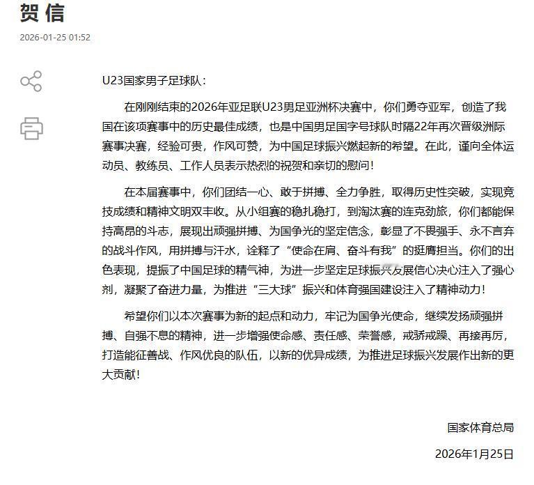 嫡长子啊!一个亚军,两封贺信。 1月25日凌晨,中国U23男足在亚洲杯决赛被日本