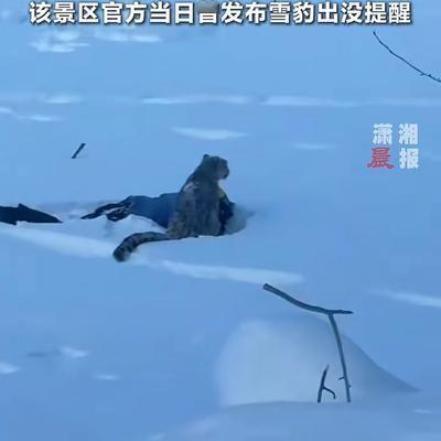 可可托海滑雪场,一名雪友被雪豹袭击后,被众人从雪地搀扶出来。 监控里那只雪豹在停