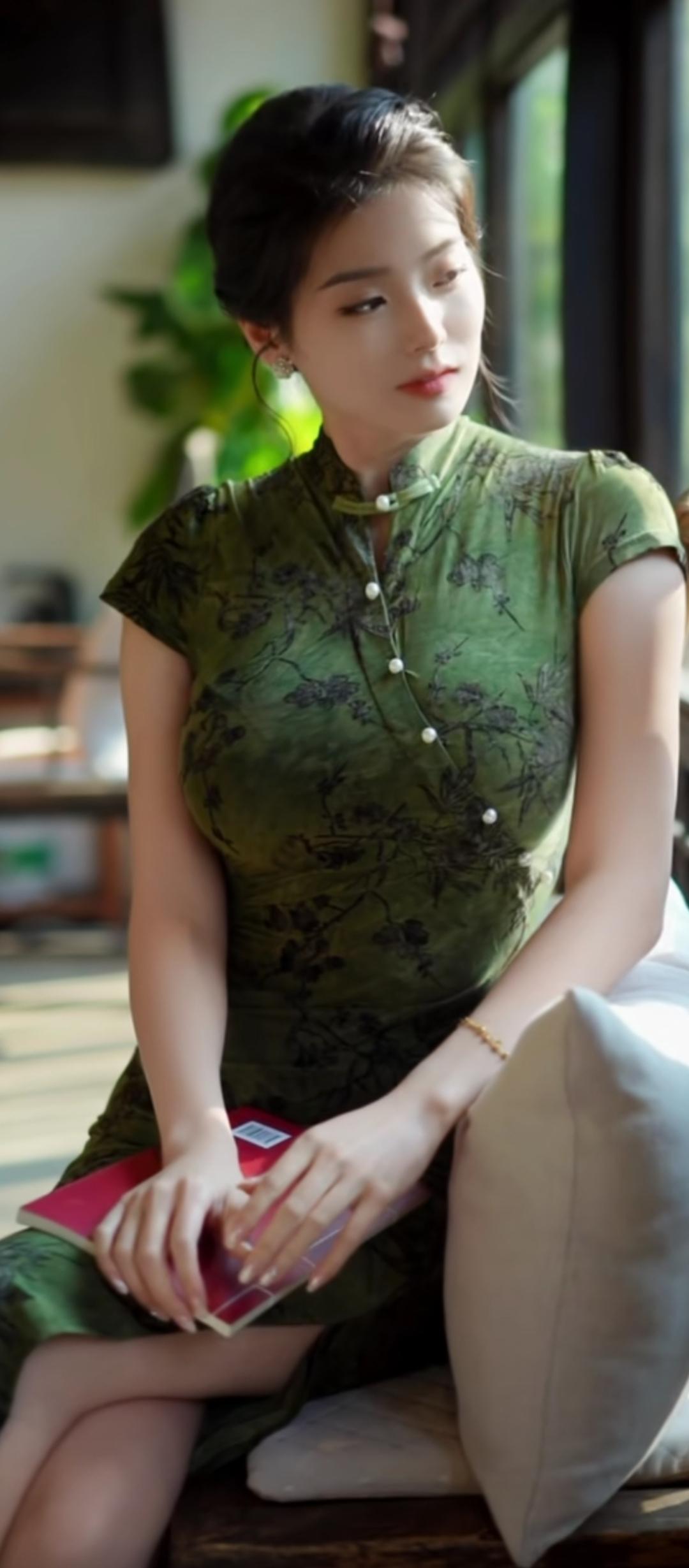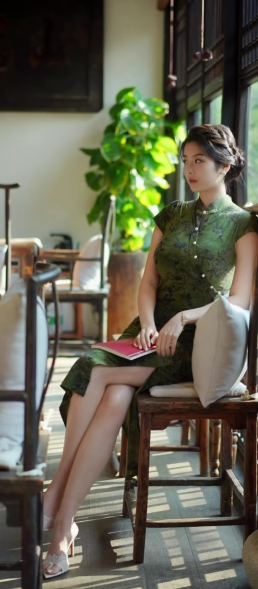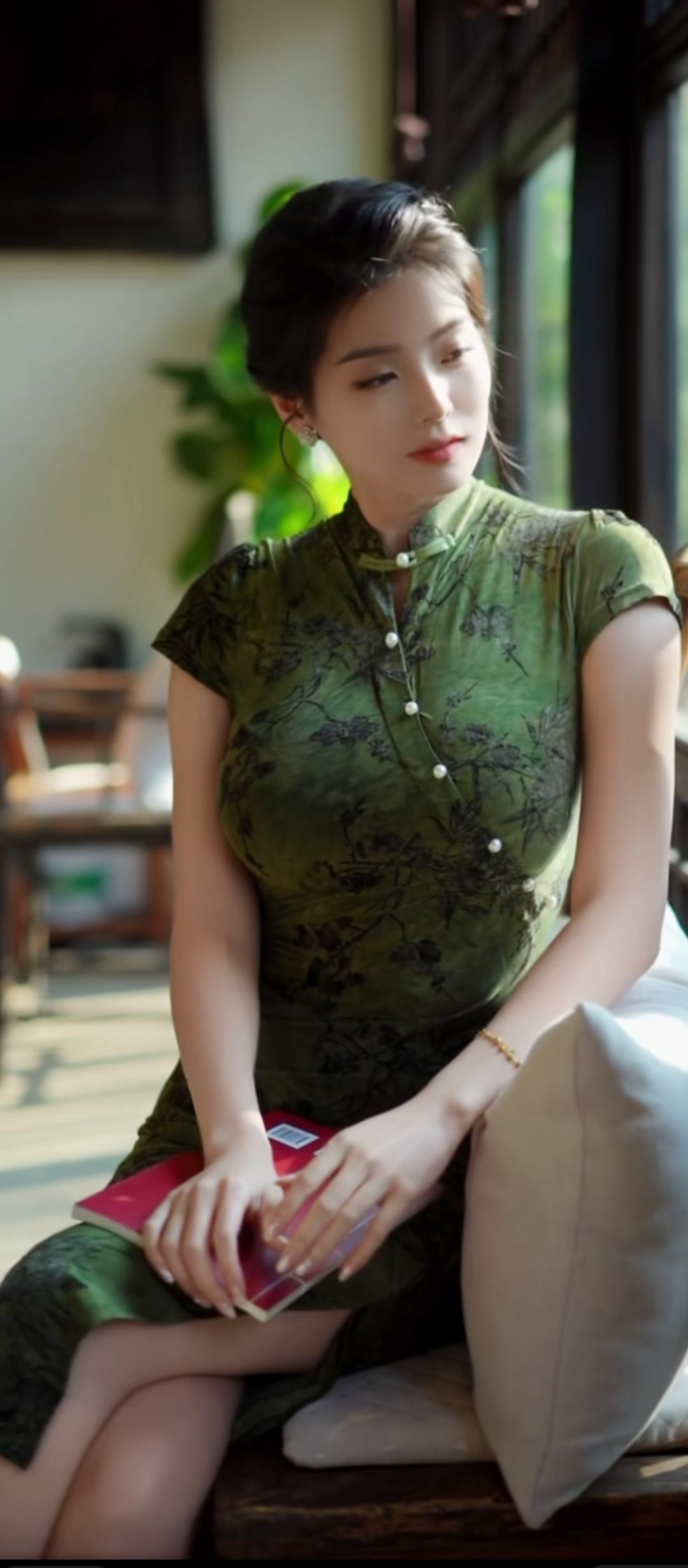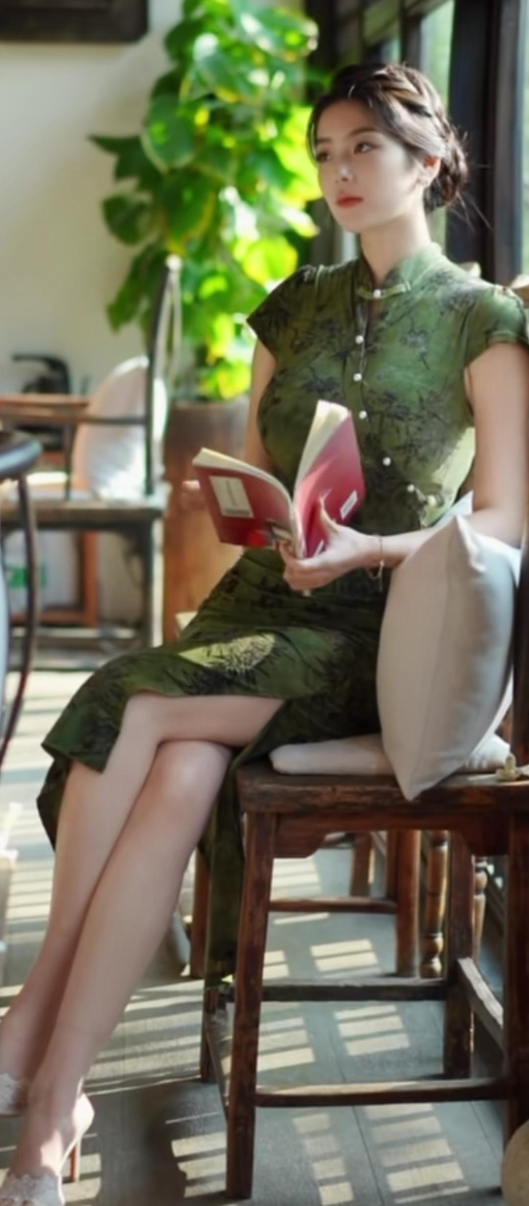 优雅绿衣女子,静坐阅读时光,享受宁静午后。