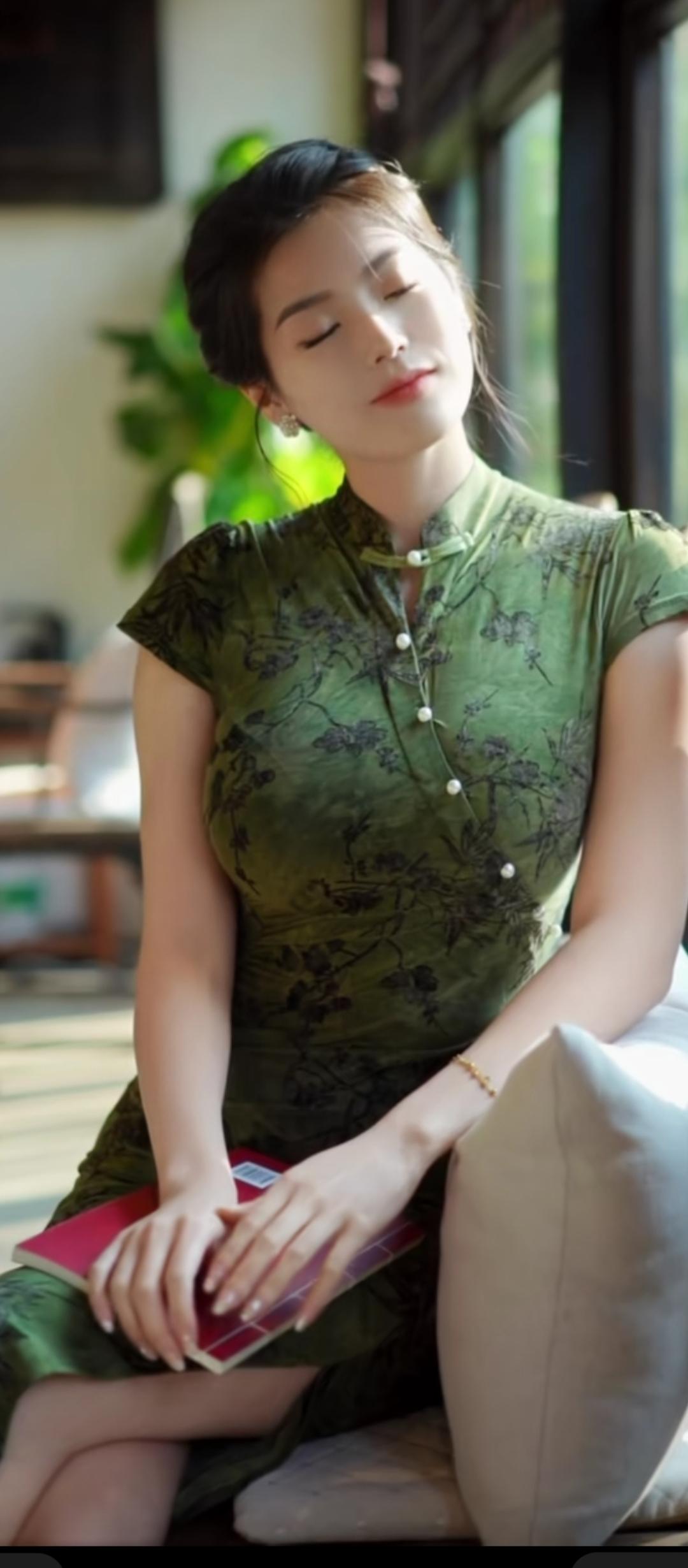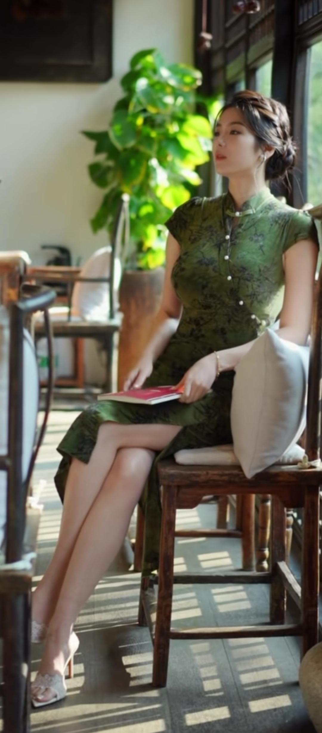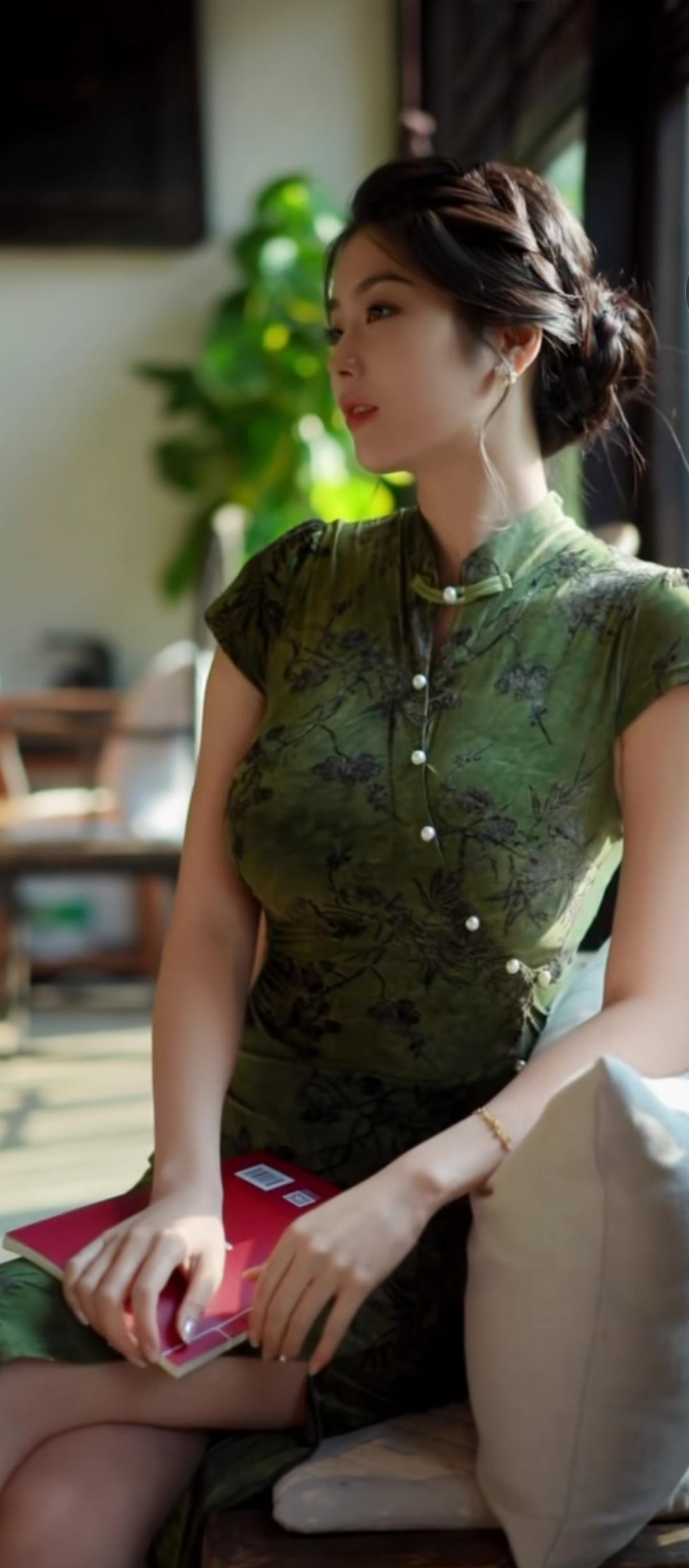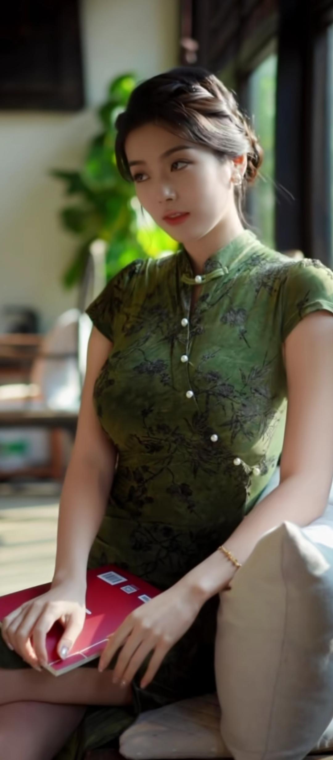 优雅绿衣女子,静坐阅读时光,享受宁静午后。
