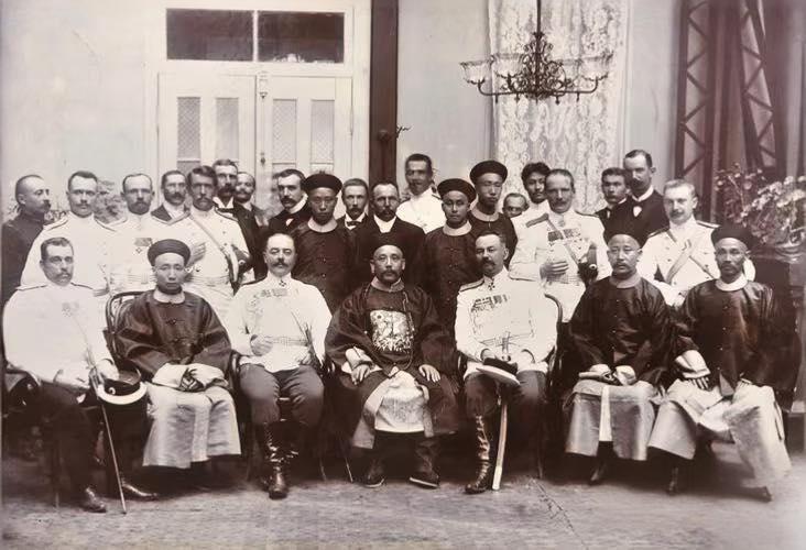 1902年10月20日,新任直隶总督兼北洋大臣袁世凯在天津利顺德饭店宴请各国驻津政商要人并留影纪念。 照片中央端坐的袁世凯,正值从山东巡抚调任直隶总督的政治上升期。在《辛丑条约》签订后的敏感时局下,他选择在当时华北最具影响力的涉外酒店设宴,既是为了向各国势力展现合作姿态、获取外交信任,也是为自己推动北洋新政争取外部支持。