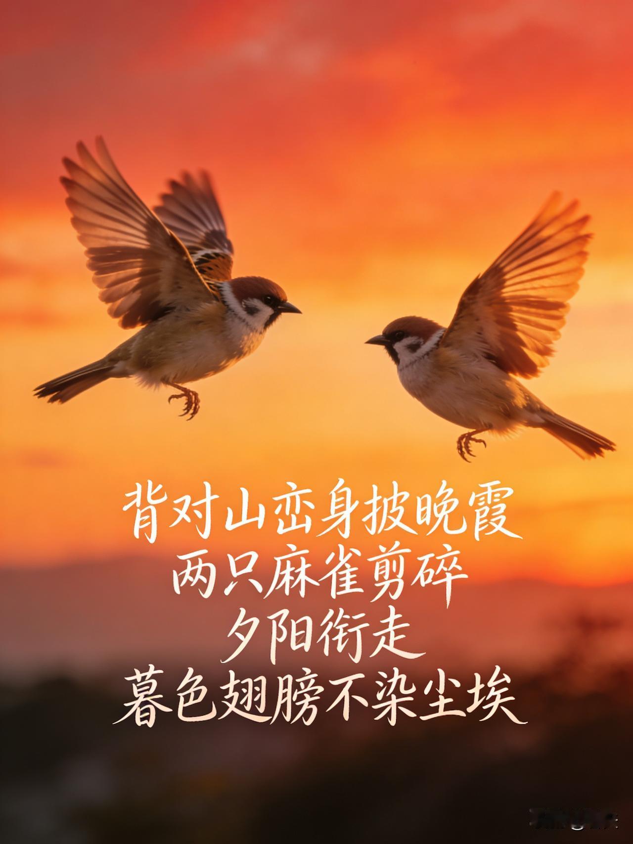 晚霞里的轻翼 背对山峦,身披漫天晚霞的温柔光晕,两只麻雀振翅掠过天际。 它们似灵动的剪子,轻轻裁碎橘红的夕阳,又衔走渐浓的暮色。翅膀不染尘埃,轻盈得如同天边舒卷的云,在暮色里划出无声却治愈的轨迹。