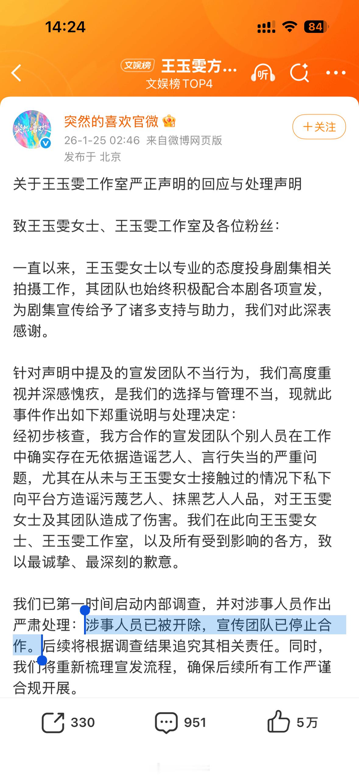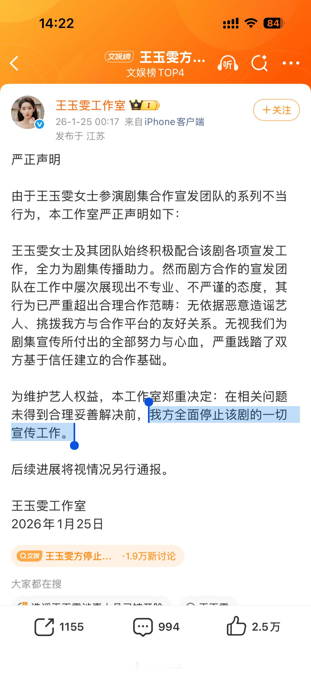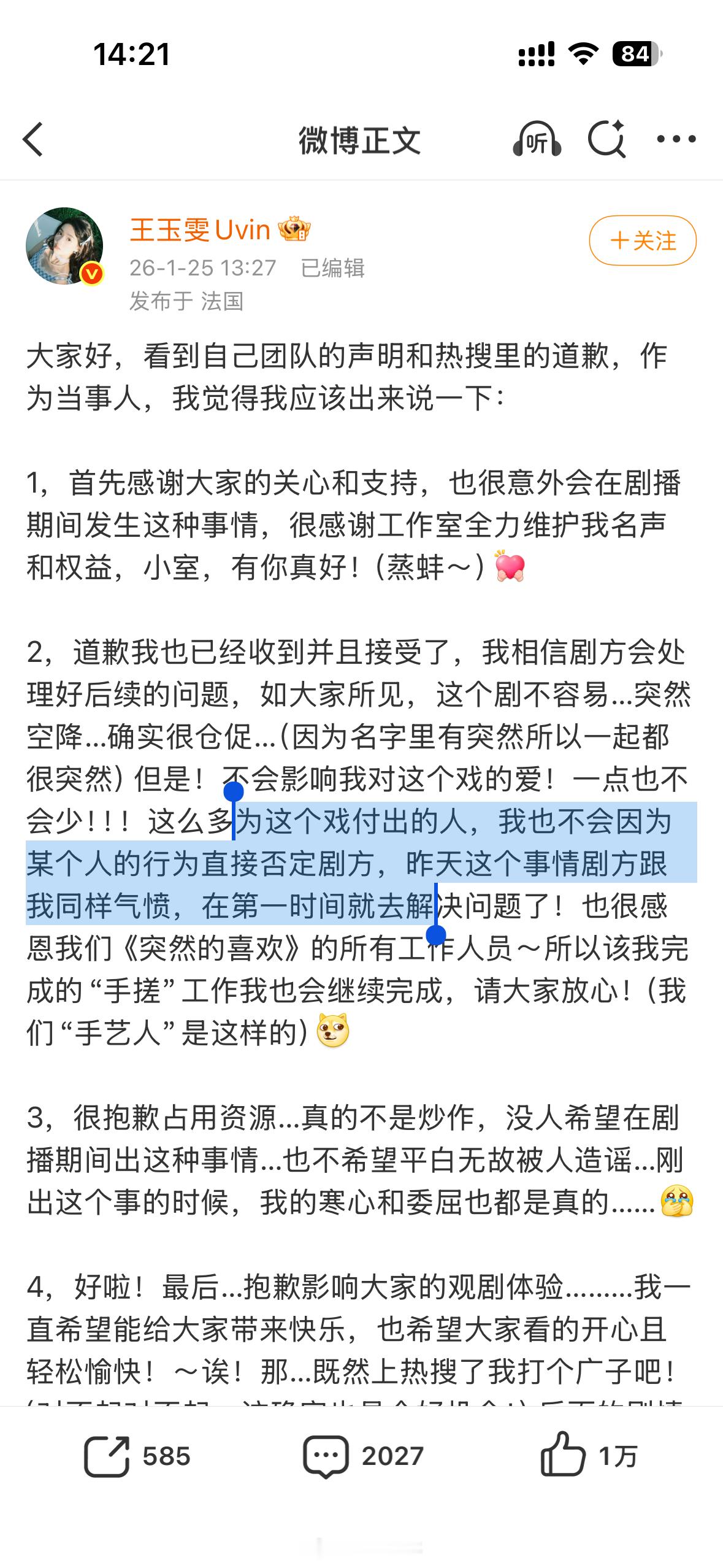 王玉雯说寒心和委屈都是真的,但觉得剧不容易,怎么都不影响对这部剧的爱,已经和剧方、平台握手言和了。昨天王玉雯工作室说不解决就不宣传新剧。注意一下时间:工作室零点罢工官微两点道歉王玉雯睡醒了发文和解真爱的话不会说不干就不干吧?真爱的世界里,只有牛马受到了伤害,在年底被开除了。