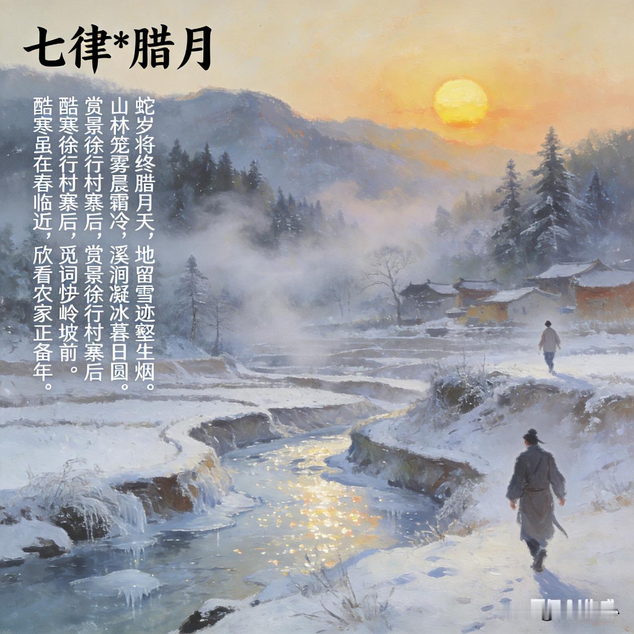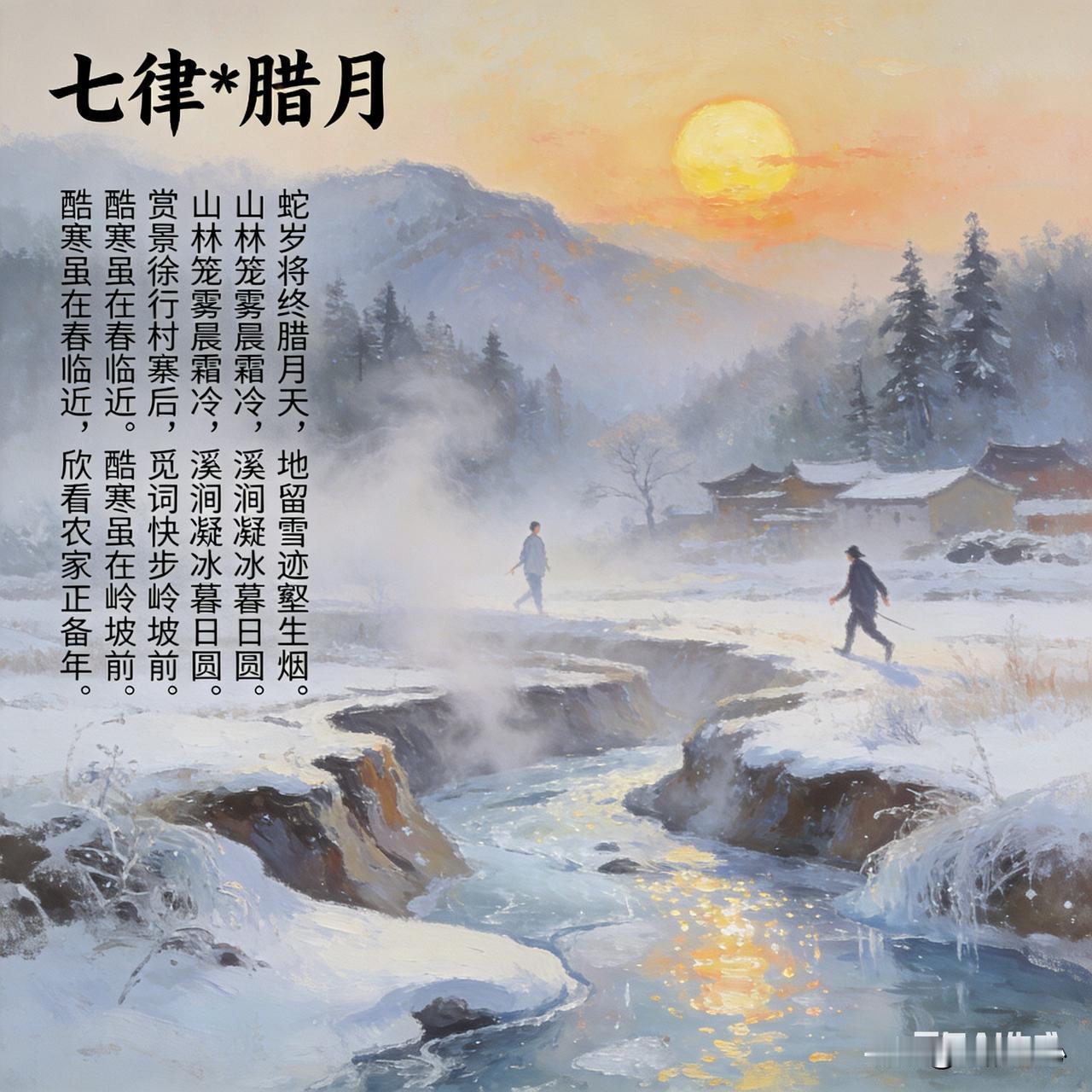 《七律*腊月》乐韵诗心原创诗词: 蛇岁将终腊月天, 地留雪迹壑生烟。 山林笼雾晨霜冷, 溪涧凝冰暮日圆。 赏景徐行村寨后, 觅词快步岭坡前。 酷寒虽在春临近, 欣看农家正备年。 这首诗词以“蛇岁将终”点明腊月时序,开篇便勾勒出残冬景象:大地留存雪痕,沟壑蒸腾寒烟,山林被晨霜笼罩,溪涧凝结寒冰,暮色中夕阳圆寂,于酷寒中尽显冬日的清寂与苍茫。 继而转入人的活动,“赏景徐行”“觅词快步”,在村寨后、岭坡前的闲步中,见出诗人对冬景的细致体察与创作兴致。末两句笔锋一转,酷寒中已藏春意,农家备年的忙碌身影,更让寒冬透出生活的暖意与对新春的期盼,于自然之景与人间烟火的交织中,写尽腊月的时序特征与生命的潜动。