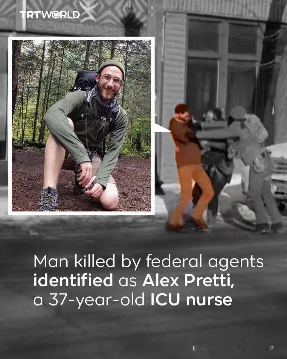 今天被ICE爆头的艾力克斯·布雷提家人的声明 “我们感到心碎,同时也无比愤怒。 艾力克斯(Alex Pretti)是个善良的人,他深深关爱自己的家人和朋友,也关心那些美国退伍军人——他在明尼阿波利斯退伍军人医院做 ICU 护士时,一直在照顾他们。艾力克斯一直希望能为这个世界带来一点改变。可惜的是,他没能活着看到自己带来的影响。 我不会随便把“英雄”这个词挂在嘴边,但他生命中最后的念头和举动,就是去保护一名女性。 当局关于我们儿子的那些令人作呕的谎言,卑劣又恶心。被川普手下那些残忍、懦弱、杀人的 ICE 暴徒袭击时,艾力克斯明明就没有拿枪。 他的右手拿着手机,左手空着,高高举过头顶,一边被胡椒喷雾喷着,一边试图保护那名刚刚被 ICE 推倒在地的女性。 请把关于我儿子的真相告诉大家。他是个好人。” --声明结束。 当地时间2026 年 1 月 24 日上午 9 时 05 分左右,37 岁美国公民、明尼阿波利斯退伍军人事务医院 ICU 护士艾力克斯,在明尼阿波利斯市 26 街与尼科莱特大道交汇处的甜甜圈店外,被美国边境巡逻队(隶属国土安全部,常配合 ICE 行动)特工击毙。 这是三周内,明市第三起联邦移民执法枪击事件。艾力克斯是继蕾妮・古德后,被ICE击毙的第二名美国公民。这一期间,ICE在抓捕(非法)移民过程中,造成的受伤或致死已经超过3000人。 Source: X
