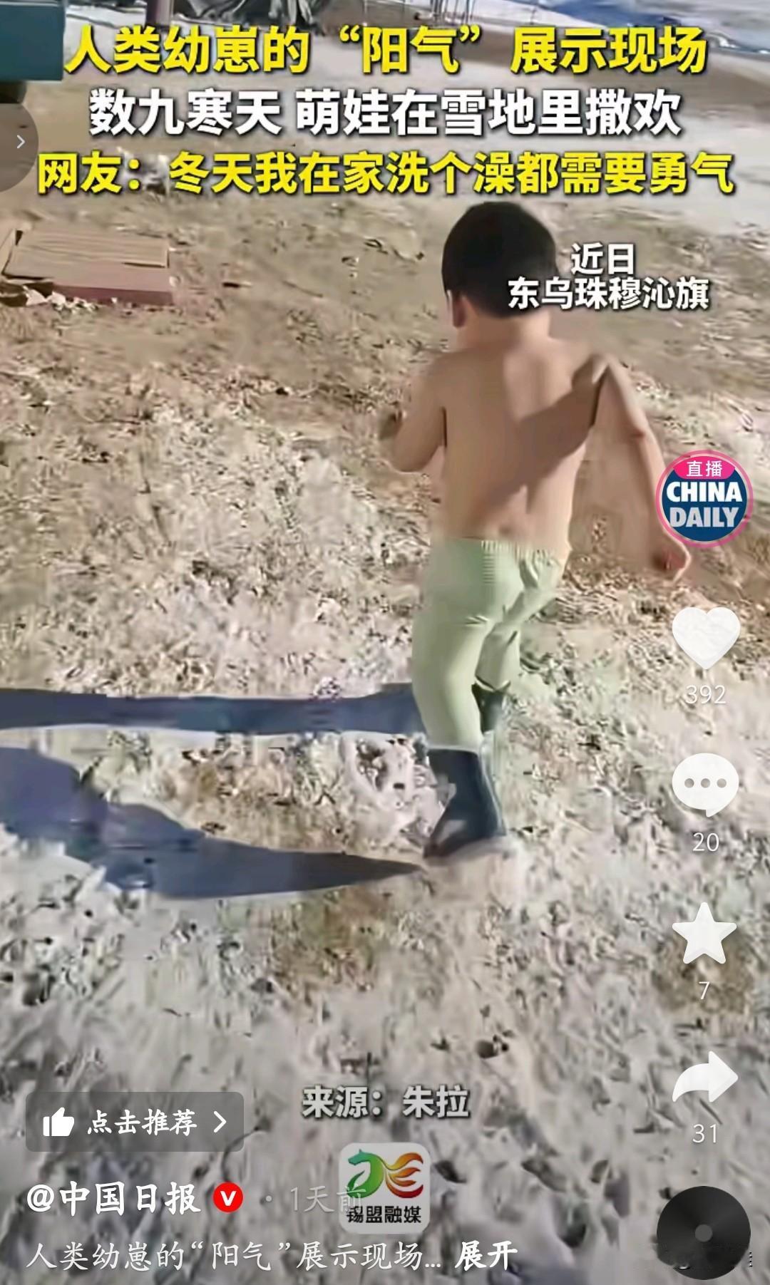 能上“人民日报”是有原因的。 数九寒天里,东乌珠穆沁旗的雪地上,一个光膀子的萌娃撒欢儿跑着,小脸冻得红扑扑却笑得没心没肺。妈妈说他平时很少感冒,身子骨特别皮实。 这一幕戳中了无数网友:我们冬天在家洗个澡都要做半小时心理建设,娃却在雪地里玩得不亦乐乎。这份浑然天成的“阳气”,没有刻意的挑战,只有草原孩子最本真的生命力。它让我们想起,原来最动人的成长,就是在天地间自在舒展,不用温室呵护,照样能长出扛住风雪的筋骨。
