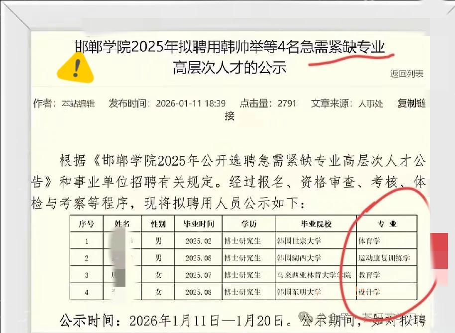 邯郸学院已经给自媒体发函了,要求撤销关于邯郸学院招聘老师的文章,因为他们认为这些文章损害了学校的声誉,也损害了学校的公信力。邯郸学院称,他们的招聘合法合规,不存在任何的萝卜岗、定向招聘等等。由于这次招聘的教育学、体育学等专业在国内高校培养规模有限。 国内不是没相关专业博士,而是邯郸学院这类地方院校陷入了引才的畸形困境,体育学博士全国年毕业不足200人,全被名校抢光,本土博士又入不了校方的“海外滤镜”眼。所谓的海外知名高校,实则多是QS排名靠后甚至未上榜的院校,校方却拿紧缺当借口,回避招聘信息不透明的核心问题。 地方院校引才难是事实,但不能用“海外学历”设隐形门槛,更不能在附加条件、应聘者资质上遮遮掩掩。公众质疑的从来不是招海归,而是这场招聘里说不清的巧合,以及用“不得已”掩盖的流程漏洞。真正的引才,该看能力而非出身,藏着掖着只会让公信力更受损。 说到底,地方院校的引才困局,从来不是选国内还是海外的问题,而是能否守住公平透明的底线,你觉得邯郸学院该用什么方式打消大众的质疑?