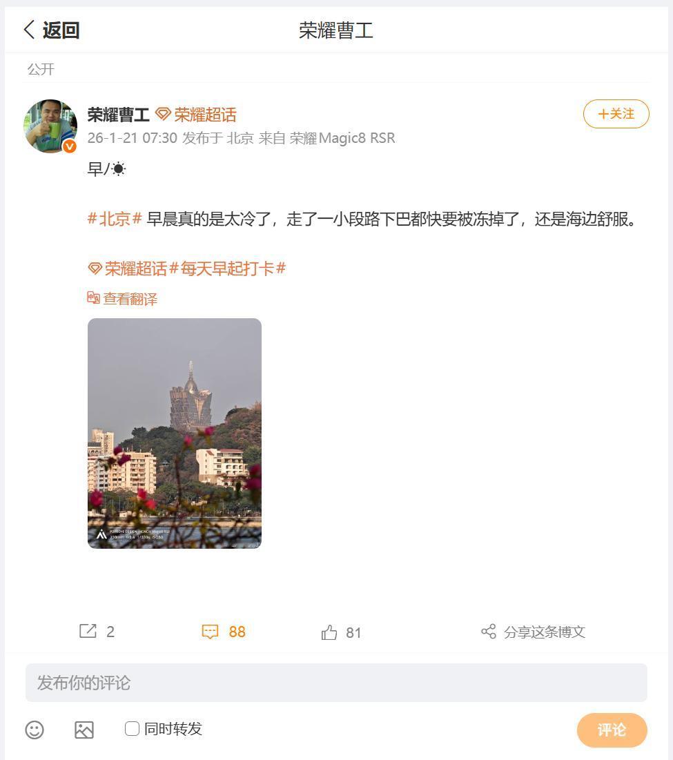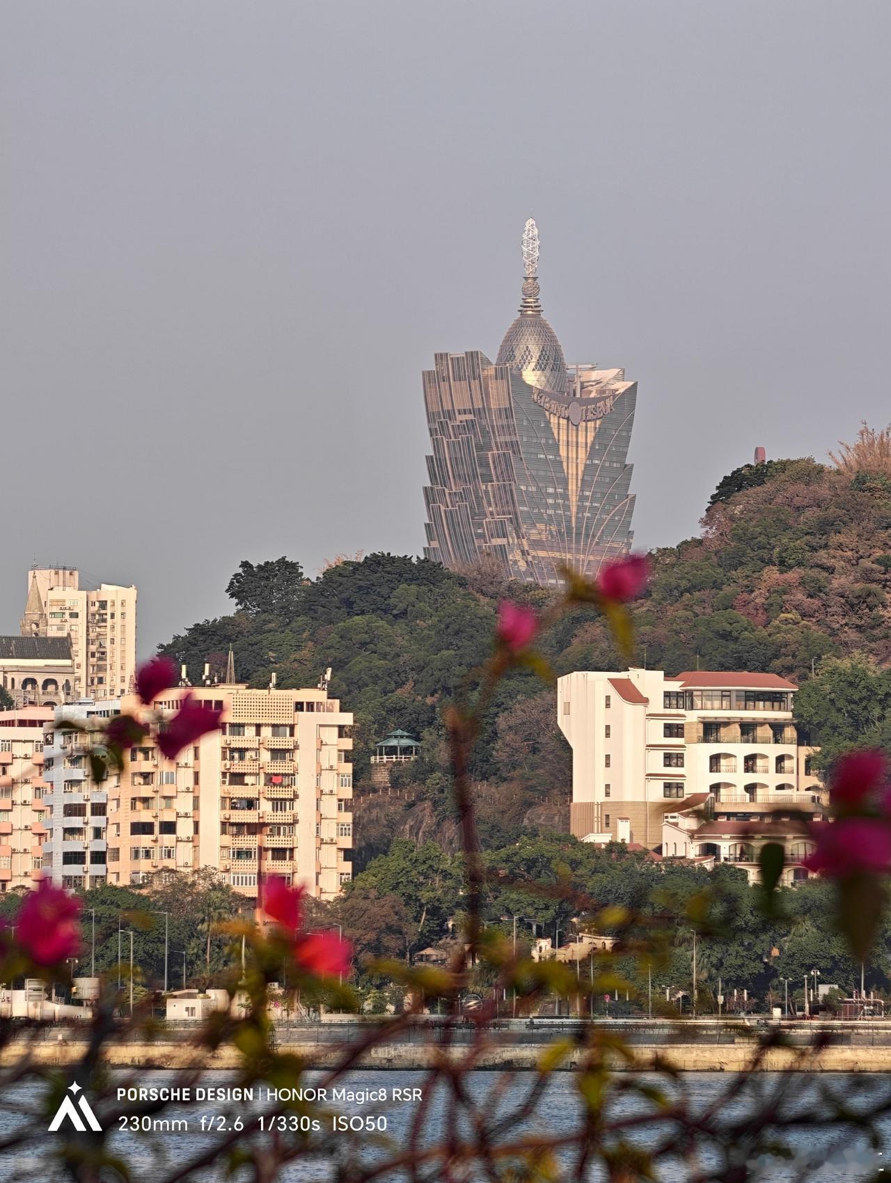 作为荣耀影像旗舰,荣耀Magic8 RSR 保时捷设计的潜望长焦,小伙伴们也非常期待,刚刚看到荣耀研发工程师曹工,分享了一张,从珠海拍摄对岸的,澳门新葡京酒店,前景的三角梅虚化蛮自然,远处建筑、山脉、澳门地标性建筑,所有元素融合在一起,我觉得也是非常漂亮的,长焦建筑物太清晰了 畅聊数码新品 数码资讯