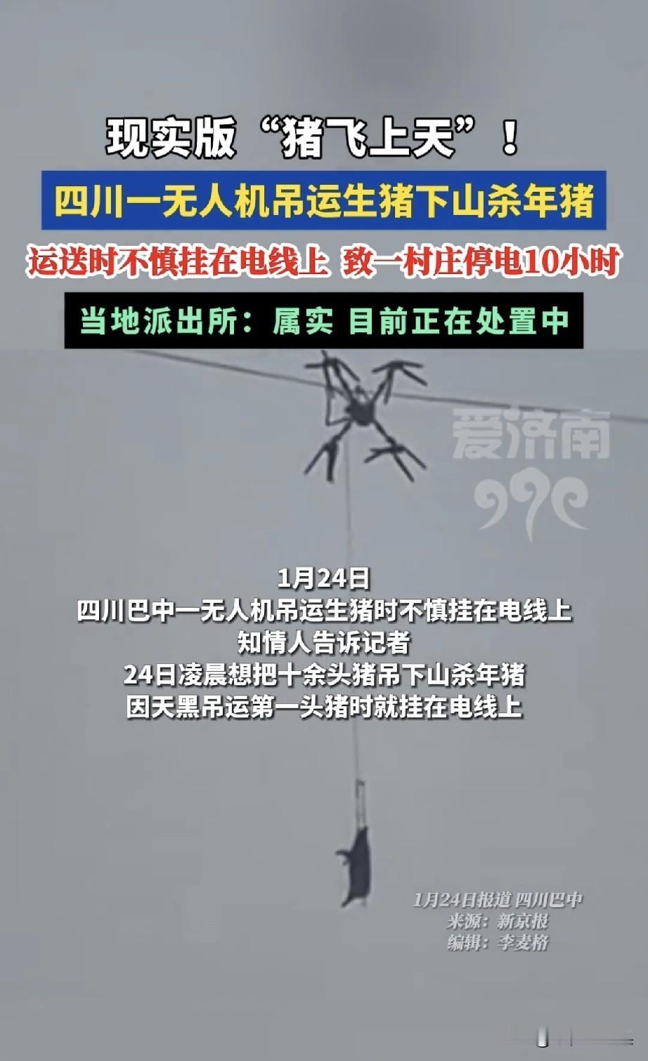 年度最惨“飞天猪”!全村停电10小时,猪:我招谁惹谁了 家人们,年度离谱事件来了! 四川巴中一村民,为了杀年猪省力气,直接掏出无人机,想把猪从山上吊下来。 结果刚飞起来,猪就精准挂在了高压电线上。这下好了,全村直接断电10小时,从凌晨黑到下午。 救援人员来了也没辙,只能干瞪眼。 猪:我只是想下山过个年,没想到先上天成了“猪坚强”,还顺便把全村的电都带跑偏了。 村民:本来想炫个技,结果成了全村笑柄,这年猪杀得,代价有点大啊! 建议给这头猪颁个“年度最佳停电功臣奖”,顺便提醒各位:高科技虽好,可别乱用在几百斤的猪身上啊!😂
