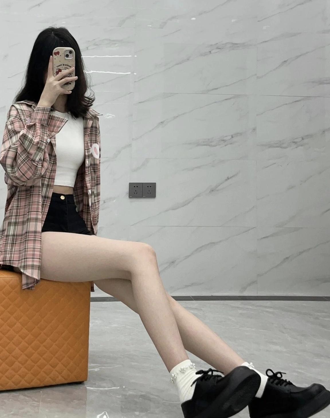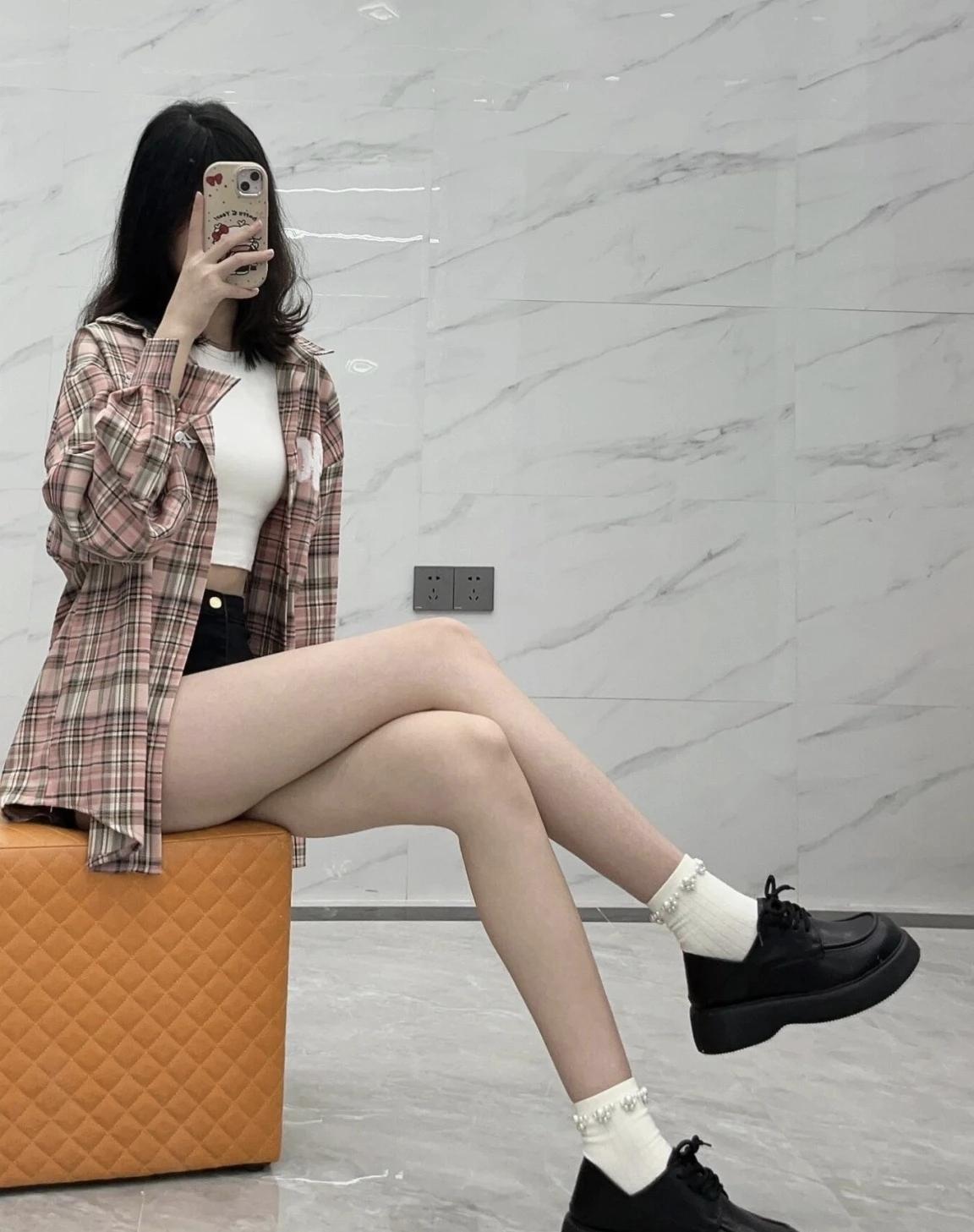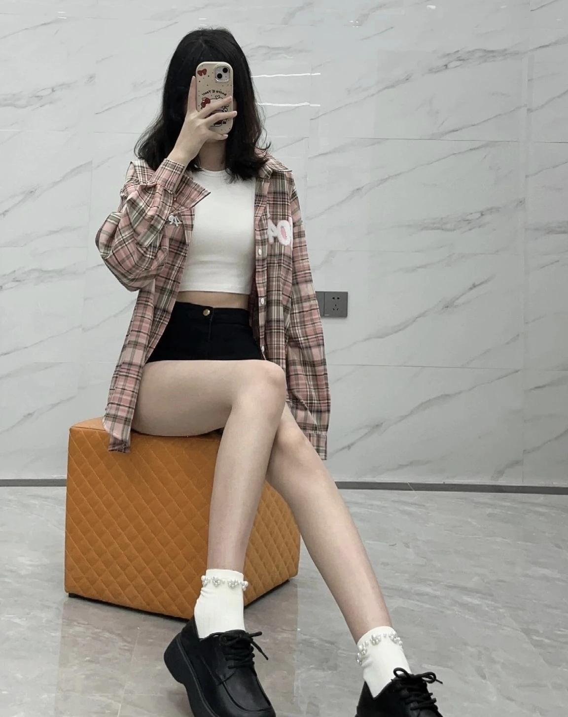复古风穿搭,格子衬衫+白色上衣,搭配黑色短裤和黑色皮鞋,时尚又舒适。