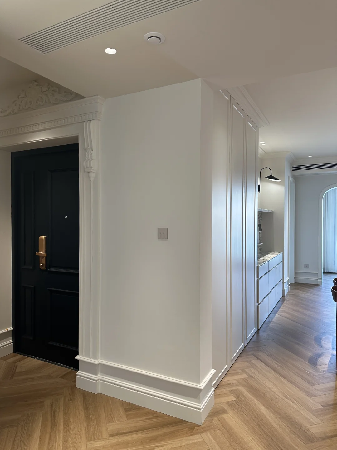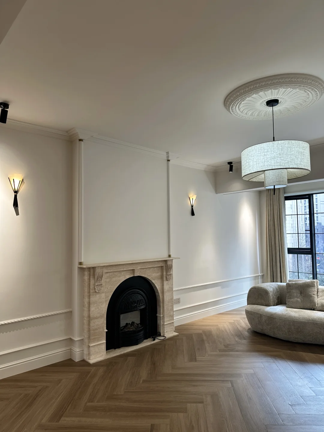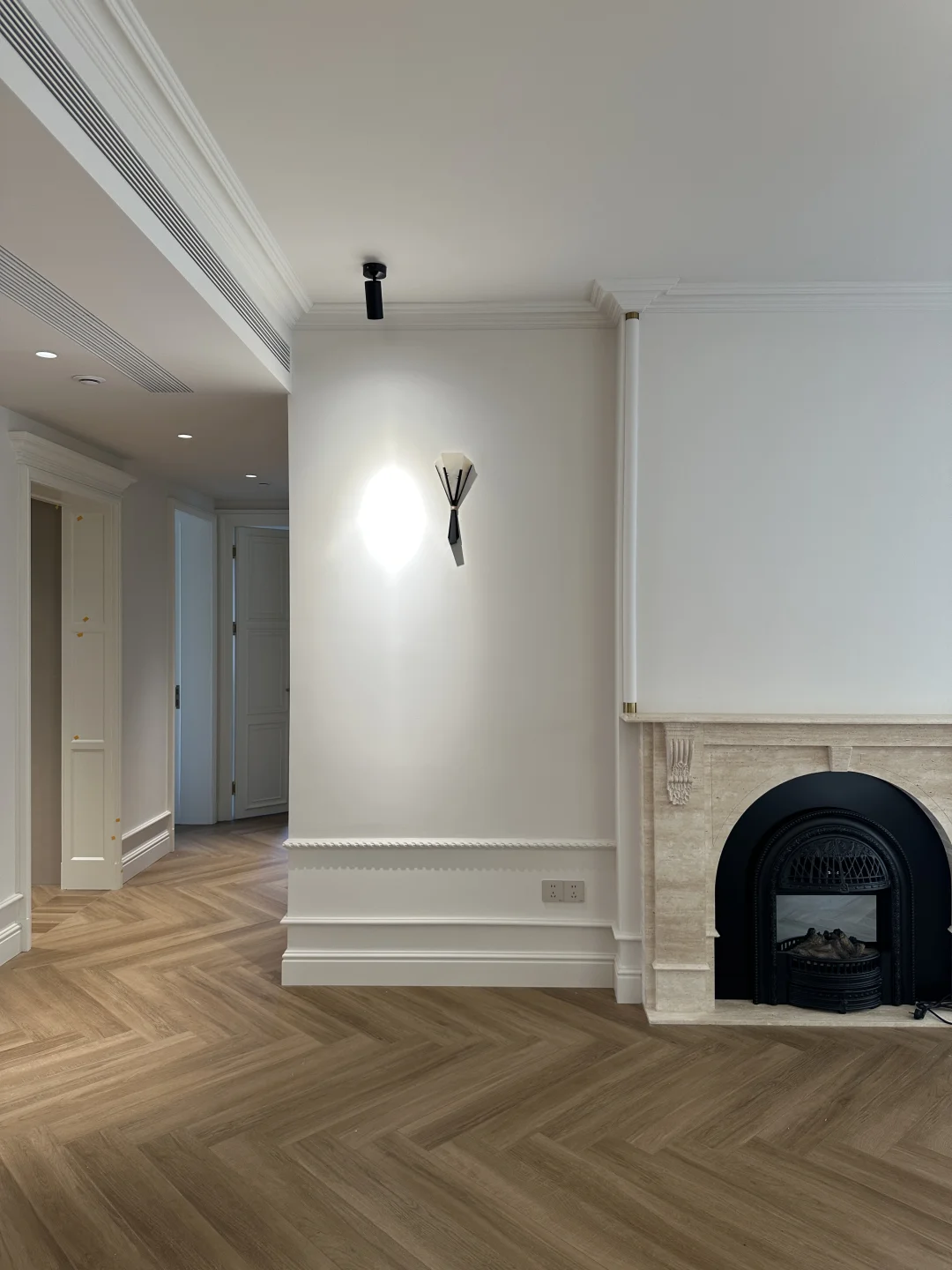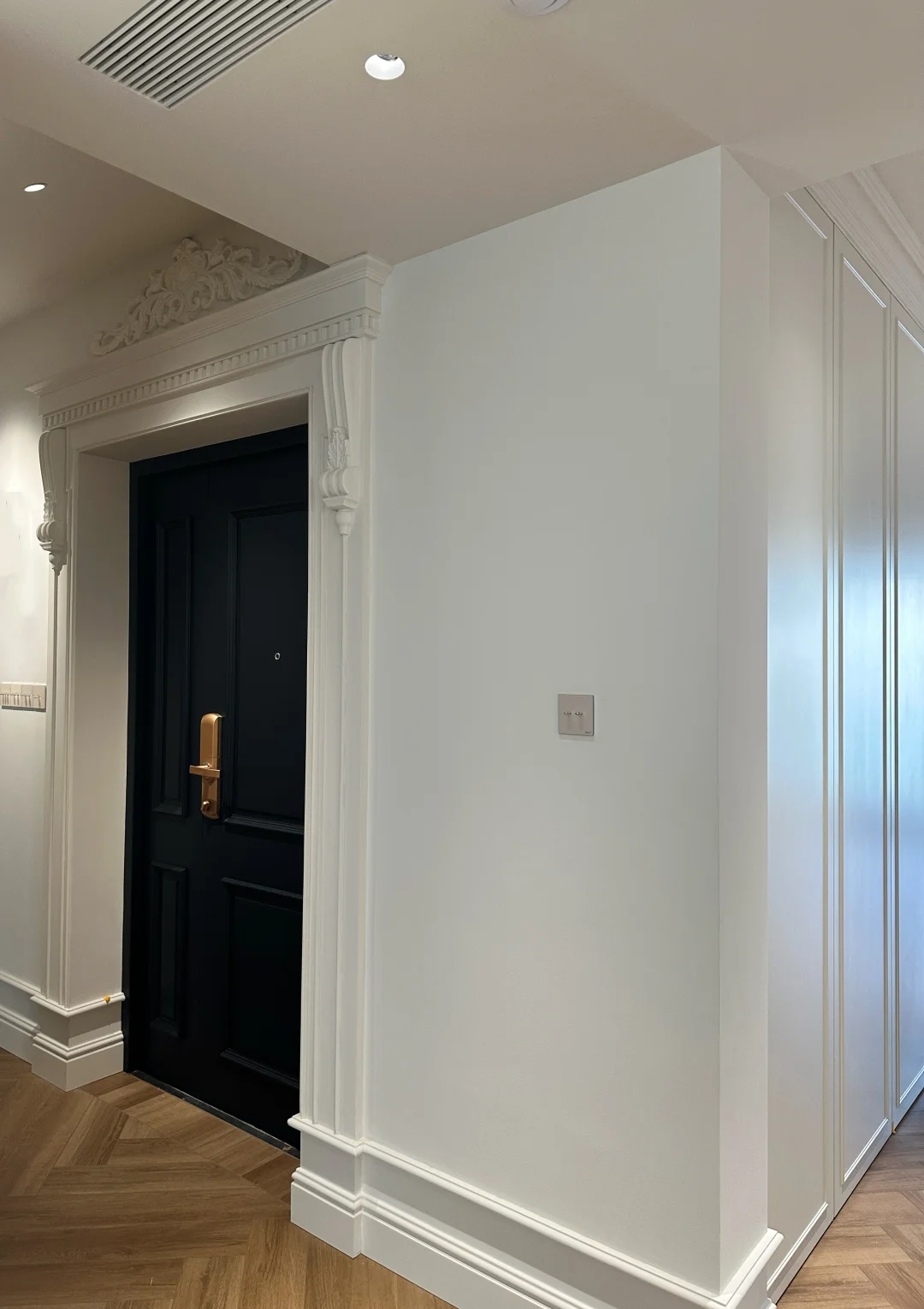 看似“空无一物”的极 简法式,每个设计都是细节 ▫️ 石膏线 梁托|拒绝模版,自己设计开模定制,线条与比例都是安静的低语。 ▫️ 壁炉|自己设计,它是客厅的呼吸感中心,而非装饰 ▫️ 入户门套|GRG模型重新组合,形成新的结构语言,入门即是仪式。 ▫️ 双开门|通往私密空间的仪式感,门型、线条、尺度,全都为空间量身原创。 . . .