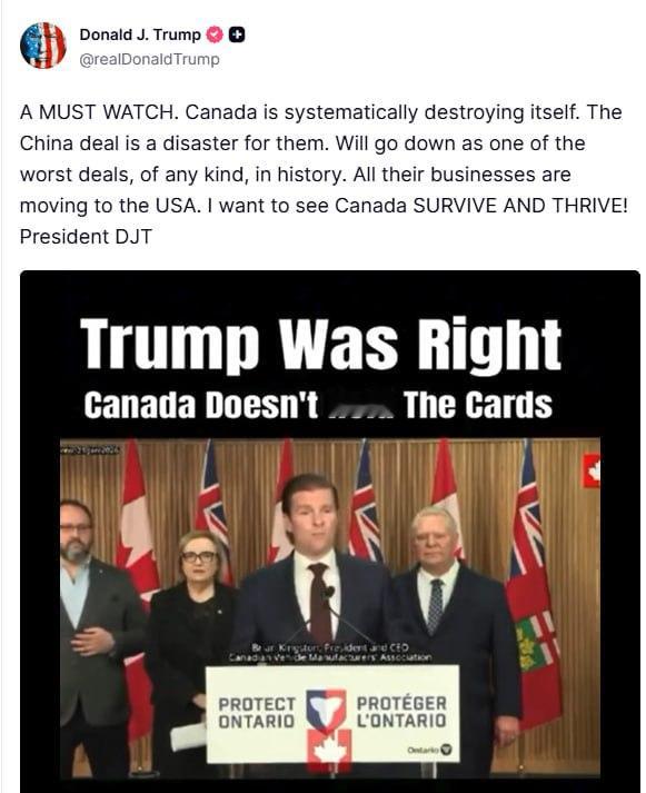 加拿大正在系统性地自我毁灭。与中国的协议对它来说是一场灾难。它将作为史上最糟糕的各类协议之一载入史册。他们所有的企业都在迁往美国。我希望看到加拿大生存和繁荣! — 美国总统唐纳德·特朗普在加拿大可能与中国达成协议的背景下继续向加拿大施压,并在他的帖子中添加了一段视频,视频中加拿大汽车制造商协会主席布莱恩·金斯顿发表演讲,警告称与北京达成协议将威胁到加拿大汽车行业的生存。
