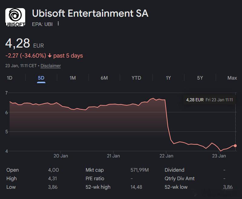 【育碧市值仅5.5亿欧元!单日股价暴跌33%,公司“大切五块”、狂砍游戏网页链接】对于法国游戏巨头育碧而言,本周四不仅是其股价的崩盘日,更是其成立近四十年来最为彻底的一次“拆解与重组”。随着公司正式公布名为“组织重置”的激进重组计划,资本市场做出了近乎恐慌性的反应,育碧股价在周四开盘后应声跳水,盘中多次触发熔断,最终收跌33%,截止1月23日市值仅剩5.5亿欧元,创下自2011年以来的最低记录。