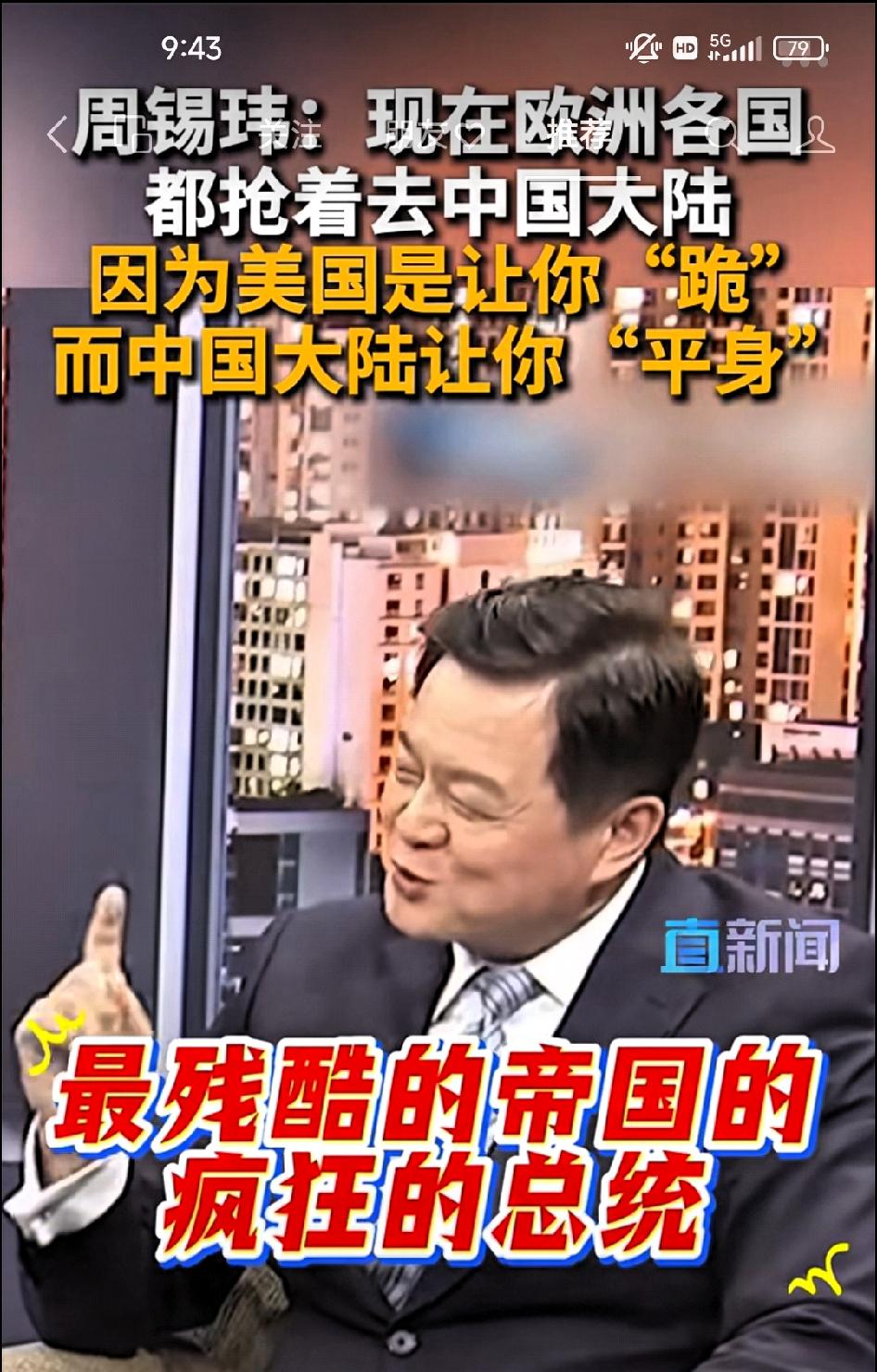 周锡玮:现在欧洲各国都抢着去中国大陆。 卡尼敢于去挑战最残酷的帝国的疯狂总统、敢于挑战他的话语、敢于挑战美国现在在全世界的影响力、挑战美国施于全世界的压力和掠夺。 欧洲这些国家为什么都要去中国大陆?我认为欧盟已经快“垮”了,被特朗普撕一下,拉一下,北约也要被美国搞垮了。 现在欧盟哪个国家敢学加拿大?都是脚很软,因为“跪”的是美国! 但中国大陆要你“平身”!