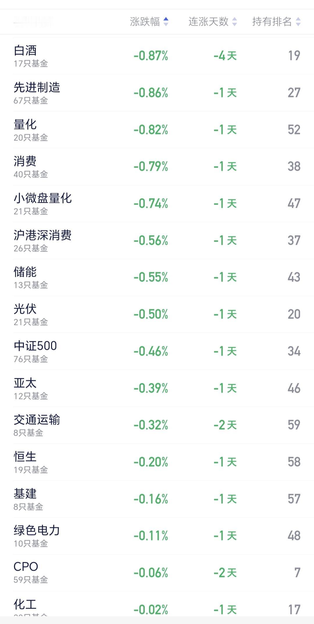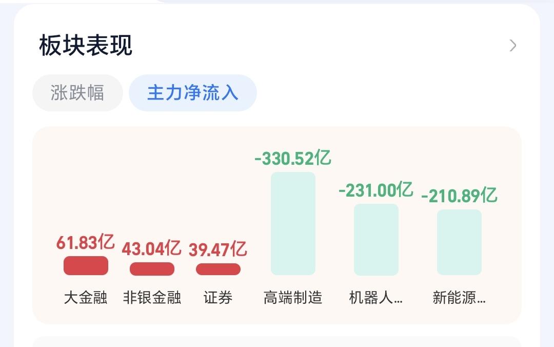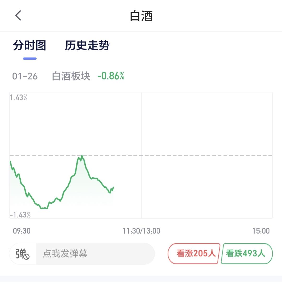 基金:今天白酒板块大跌,我却在大笑 持有的基金中,现在下跌幅度最大的是可控核聚变板块和军工板块,这两个板块的走势是相似的,基本上是同涨同跌,所以我们只要持有一只就可以了,持有的白酒板块基金盘中估值下跌了1.72%,持有亏损率已经超过了15%。 白酒板块今天是连续第四个交易日下跌,持有人数在所有板块当中排名第19位,这个板块当中的散户人数少了很多,也就是很多人已经在这个地方割肉走了,我肯定是不会割肉的,我会继续定投,我会每天继续定投200块钱,今天白酒板块大跌,我却在大笑,因为,今天的200块钱又可以多捞一些筹码了,花同样的钱,办更多的事,到哪里去说,也是一件好事情,什么时候想起来,心里面也会偷偷的笑。 看下面的截图6,这是白酒板块日K线图,我画了一条日线级别的短期下跌通道,今天的下跌,距离下跌通道下轨线又近了一步,距离下跌通道下轨线越近越安全,如果缓慢下跌到下跌通道下轨线附近,那里是一个可以考虑的进场点,看到这越来越近的位置,我怎么能够做到不哈哈大笑,如果是你,你也会哈哈大笑的,请你想笑就笑,不可以偷偷的笑。 现在上证指数小涨,创业板指和深成指小跌,涨1700多家下跌3600多家,下跌家数超过了上涨家数,涨停53家,跌停20家,涨停家数超过了跌停家数,两市累计成交21594亿,相比于上周五放量了21%,但相比于刚才25%的放量幅度要好一点,主力资金净流出801亿,净流出幅度在进一步放大。 看下面的截图8,这是主力资金进出板块的情况,主力资金净流入最多的三个板块是:大金融板块,非银金融板块,证券板块,主力资金净流出最多的三个板块是:高端制造板块,机器人板块,新能源板块。 投资需要逆向思维,玩基金也需要逆向思维,人多的地方不去,热闹的地方不去,这就是逆向思维,买在无人问津处,卖在人声鼎沸时,这也是逆向思维,许多人知道,逆向思维的道理,但真正让他做起来很难很难。 大家帮忙评论,点赞,转发和分享,谢谢大家的支持。