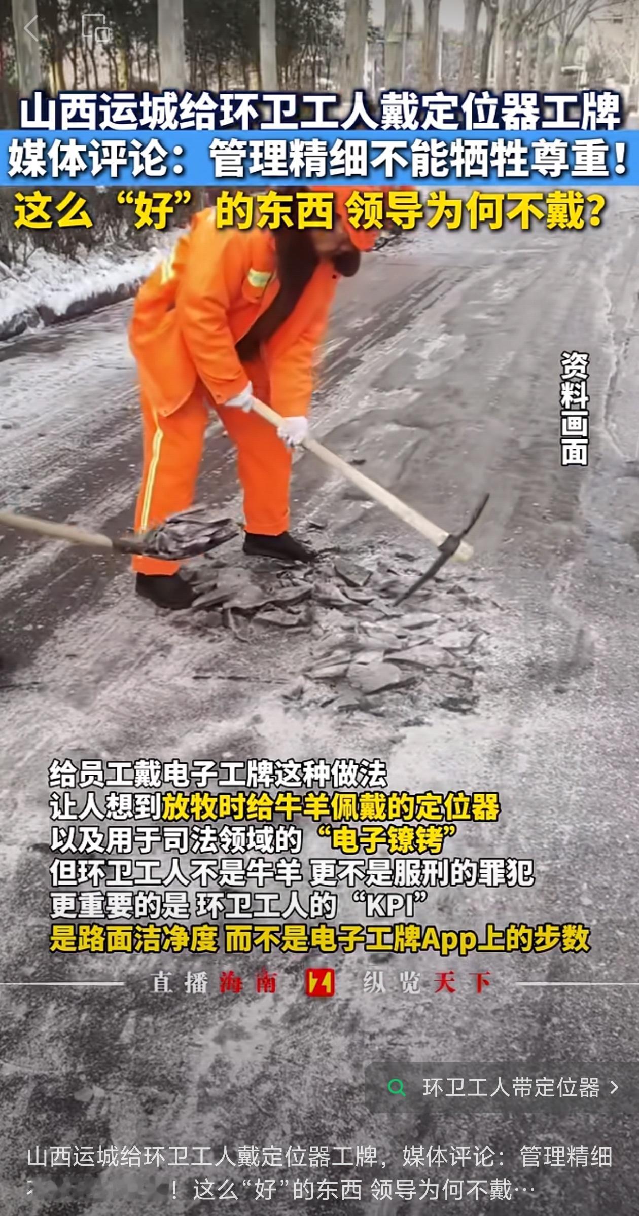 大雪天里,运城的环卫工人们天没亮就上街了。一位工人扫着扫着,跟路过的市民叹了口气:“身上戴着定位器呢,停久了要罚款。”这话比落在脖子里的雪碴子还戳心。 事情传开后,管理部门很快出了说明:那不是单纯的定位器,是带SOS求救、打卡和调度功能的电子工牌,为了安全,尤其考虑到不少环卫工人年纪大了,万一出事能及时找到人。他们也否认了“休息就处罚”的规定。 道理是这个道理,可落到实际干活的人身上,滋味就不一样了。环卫工大多是上了年纪的人,扫一段,喘口气,搓搓冻僵的手,现在总感觉有双眼睛在背后盯着。技术本是护身符,弄不好就成了拴在身上的电子绳子——拴住了安全,是不是也拴住了那点喘息的自由? 城市要干净,要效率,这都没错。可管理的尺子,量得了街道的落叶,也该量得出人心的温度。说到底,城市的脸面是这些“城市美容师”一点一点扫出来的,他们的尊严,不该在风雪里被冻得缩手缩脚。喝口热水、避会儿风,不该变成需要胆战心惊计算时间的“违规风险”。环卫工人