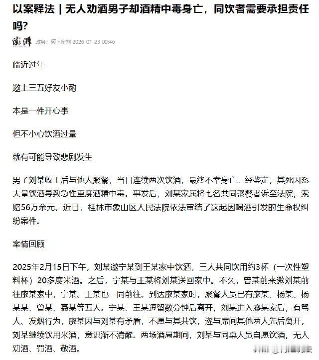 **他最后一杯酒下肚时, 桌上正放着一盘剥好的荔枝。 朋友说:“解酒,吃点甜的。” 没人告诉他: > 酒精代谢率,和荔枝糖分,会联手压垮肝脏最后的警报系统。** 广西桂林,38岁的货车司机韦明,聚餐两场,共饮白酒1.2斤。 首轮在老友家,他主动敬三轮; 第二场被拉去大排档,没人劝酒,也没人拦酒—— 只有一句轻飘飘的:“明哥海量,来,走一个!” 他离世后,妻子翻他手机,发现凌晨1点还有未发完的微信: > “刚吃完,挺好……别担心,我骑车慢点……” 后面三个句号,再没下文。 7名同饮者被诉,索赔56万。 法院判决书第4页写着: ✅ 全员担责,但比例悬殊—— → 主动邀约第二场的李某,担责35%; → 唯一全程未饮酒、却两次起身帮韦明擦汗的陈师傅,担责1.5%; → 而那句“海量”的附和者,担责8%。 最震动全城的,是判决书末尾加粗的一行: > **“法律不惩罚沉默,但惩罚对危险的‘合理预见性缺失’。 > 当一个人已出现言语迟缓、手抖、反复揉太阳穴—— > ‘没劝酒’不是免责金牌, > 是清醒者放弃行使‘叫停权’的开始。”** 这不是判罚,是启蒙: ✅ 桂林中院联合卫健委发布《聚餐场景风险识别指南》: → 将“三次以上揉太阳穴”“筷子拿反”“重复同一句话”列为一级预警信号; → 餐饮场所强制张贴“叫停权提示卡”:“您有权打断任何一场可能危及生命的饭局。” ✅ 更首创“清醒者守护计划”: → 同桌三人以上,系统自动触发“健康守护提醒”; → 扫码即可一键呼叫代驾+120+社区网格员,全程匿名。 结案那天,陈师傅把判决书复印了7份, 每份夹进一盒降压药里,送给了当天在场的人。 盒底贴着一张便签: > **“下次饭局, > 我不敬你酒。 > 我只问你一句: > ‘你还记得自己,是谁的孩子、谁的丈夫、谁的父亲吗?’”** 真正的友情,不是陪你喝到断片, 而是敢在你端杯前,先碰一下你的手背。 禁止酒桌劝酒 五杯酒文案