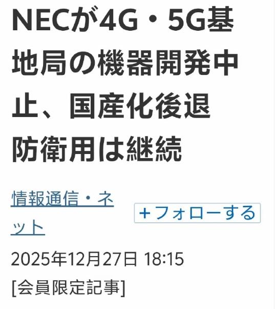 日本NEC向华为认输,宣布退出5G电信市场,韩媒感慨全线溃败! 2026年初,一则来自日本的消息震动了全球通信产业圈:NEC公司正式宣布停止4G和5G无线基站硬件的研发。公司总裁森田隆之在《日经亚洲》的采访中直言:“原则上,我们未来将不再投资研发4G或5G基站。”取而代之的是,公司将资源集中到高利润的软件服务与军工领域。 可能有人不知道NEC的分量,这家日本百年老店,以前在通信领域也是有头有脸的角色。 2020年的时候,NEC还和日本电报电话公司(NTT)高调合作,NTT一下子投了644亿日元,俩人立下目标,要到2030年拿下全球20%的基站市场份额,野心不小。 可短短五年时间,这雄心壮志就彻底泡汤了,前后花了42亿日元的研发费用,最后落得个黯然退场的下场。 NEC之所以撑不下去,核心就一个原因:竞争不过华为等中国企业,在全球市场里连立足之地都快没了。根据国际市场调研机构Omdia的数据,现在全球基站市场近80%的份额,都被中国华为、瑞典爱立信、芬兰诺基亚这三家牢牢攥在手里。 而日本的NEC和富士通加起来,市场份额还不到2%,在这种赢家通吃的格局里,根本没有翻身的机会。 5G基站这行,本来就需要持续砸大钱搞研发,而且得有足够大的出货量,才能把前期的研发成本摊薄,形成良性循环。华为在这方面的优势太明显了,不仅技术成熟,出货量也大,成本控制得好,设备的性能和价格都很有竞争力。 反观NEC,市场份额上不去,每造一台基站的成本都居高不下,越研发越亏损,越亏损越难扩大份额,最后只能恶性循环,走投无路。 更要命的是,连日本本土市场都不待见NEC了。以前日本最大的移动通信运营商NTT Docomo,一直优先采购NEC、富士通这些本土品牌的设备,给它们搭了个温室。 可到了2024年,NTT Docomo也变了卦,开始加大从爱立信等海外企业的采购力度。连自己人都不支持了,NEC在本土的生存空间也被挤压,这日子自然没法过。 其实NEC也不是没找过突破口,之前它把希望寄托在Open RAN技术上,还算是这个技术路线的积极推动者。本来想着靠这个技术打破传统巨头的垄断,实现弯道超车,西方国家排挤华为也给了它点政策机会。 可理想很丰满,现实很骨感,Open RAN技术看着先进,实际落地的时候问题一大堆。不同厂商的设备没法顺畅兼容,集成起来又复杂又费钱,运维难度也大,根本没法和华为的成熟设备比。到最后,Open RAN也没能救得了NEC。 NEC的退场不是个案,而是日本整个通信设备产业集体溃败的缩影。2024年7月,另一家日本通信巨头富士通就把基站相关业务剥离出去,成立了个子公司,相当于把这块烂摊子隔离开。 原本计划2027年进入5G基站市场的京瓷,评估完形势也直接放弃了。曾经在3G时代还能和欧美企业掰掰手腕的日本厂商,现在在5G领域几乎全面退出,连本土市场都守不住了。 这背后说到底,是日本产业的老毛病犯了。长期以来,日本通信设备市场形成了封闭的小圈子,运营商和本土厂商绑在一起,在温室里待久了,就失去了全球竞争的能力。 它们习惯了满足本土的特定需求,研发的技术和产品脱离了全球主流标准,等到5G时代全球化竞争到来,就发现自己的产品在性能、成本上都差了一大截。 而且日本企业在软件和人工智能领域短板明显,现在5G设备越来越讲究智能化,日本这方面跟不上,自然越比越落后。 再看看中国这边,华为在5G领域的优势越来越稳固,不仅技术领先,市场份额也遥遥领先。 工信部的数据显示,截至2025年11月末,我国5G基站总数已经达到483万个,占移动基站总数的37.4%,而且还在持续增长。 华为还不断推进技术升级,和运营商合作完成高铁沿线5G网络升级、5G-A技术部署,这些都让中国在全球5G竞争中牢牢掌握主动权。 NEC转向软件服务和军工领域,看似是换了赛道,其实是被逼无奈的选择。在公共基站市场彻底没了希望,只能去小众领域找口饭吃。可就算换了赛道,日子也未必好过。 软件服务领域有华为、思科等企业竞争,军工领域又受限于日本的产业格局,想重现以前的辉煌基本不可能。 韩媒感慨日本全线溃败,一点都不夸张。从通信设备到消费电子,再到新能源赛道,日本产业这些年一直在走下坡路。 固守老技术、脱离全球市场、对新技术反应迟缓,这些问题叠加在一起,让日本在新一轮科技竞争中逐渐掉队。而NEC退出5G基站研发,不过是日本产业衰退的又一个证明,也从侧面印证了中国通信技术的强大。