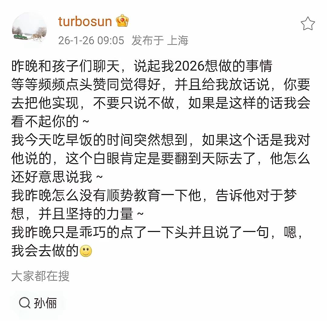 1月26号,孙俪说自己被儿子等等“教育”了,回头想起来还忘了“回怼”回去。 事儿是这样的,昨晚她跟孩子聊2026年的计划,等等一边点头说好,一边撂下句:“你得真去做,别光说不练,不然我会看不起你的。” 当时孙俪没反应过来,乖乖点头说会去做。结果今天才回过神:这要是我对他说这话,他那白眼估计能翻到天灵盖上去! 你看这母子俩的互动,是真有意思。孙俪能跟儿子聊自己的年度计划,压根没把他当小孩,完全是朋友式的平等对话。 其实啊,好的亲子关系从来不是单向的“管教”,而是能互相“怼”、彼此听进去。孩子敢直愣愣提要求,大人也能笑着接招,这种松弛感里藏着的,才是最扎实的信任。 你家有没有过这种“被孩子教育”的时刻?那种时候,是不是比说教管用多了?