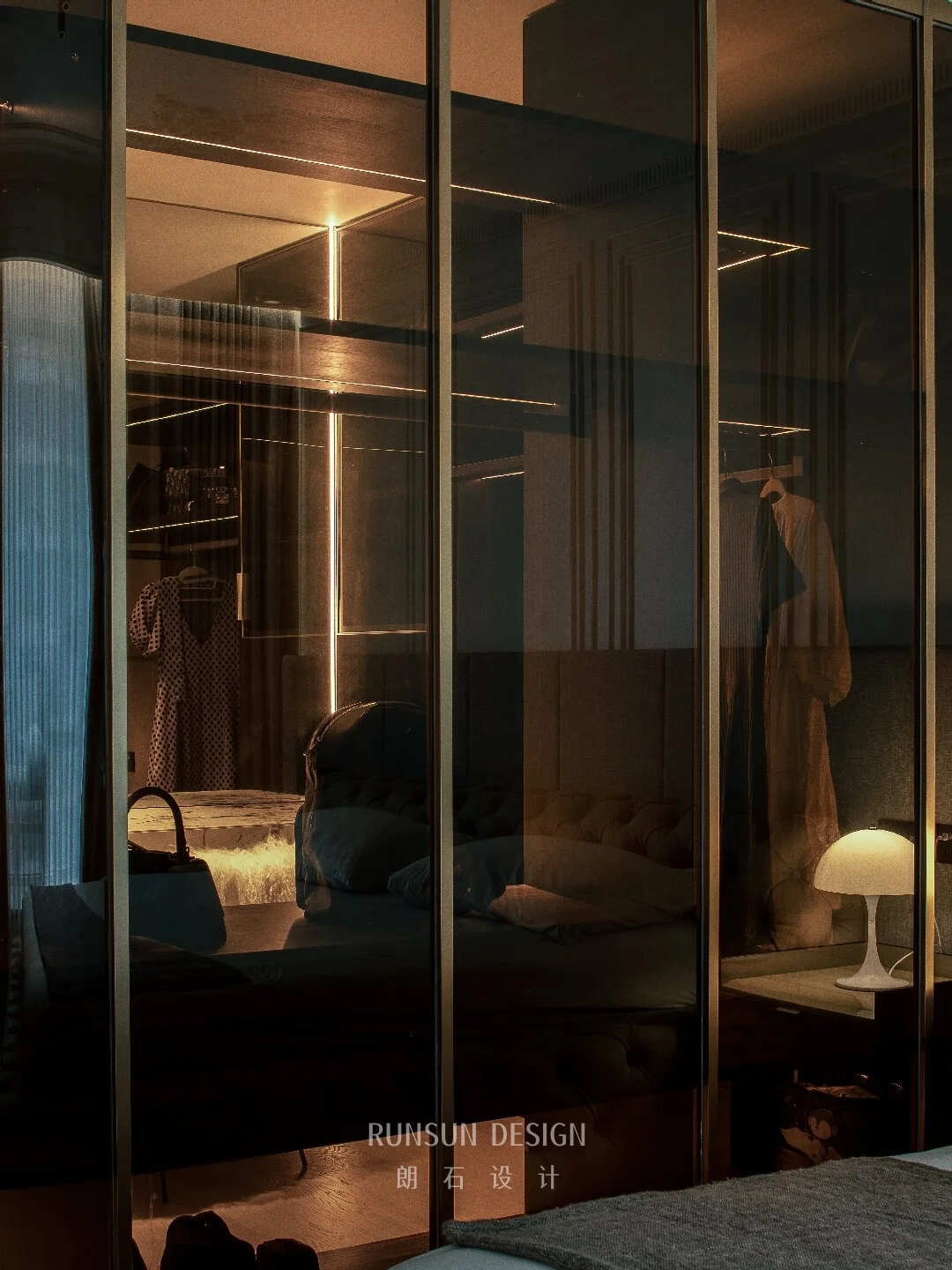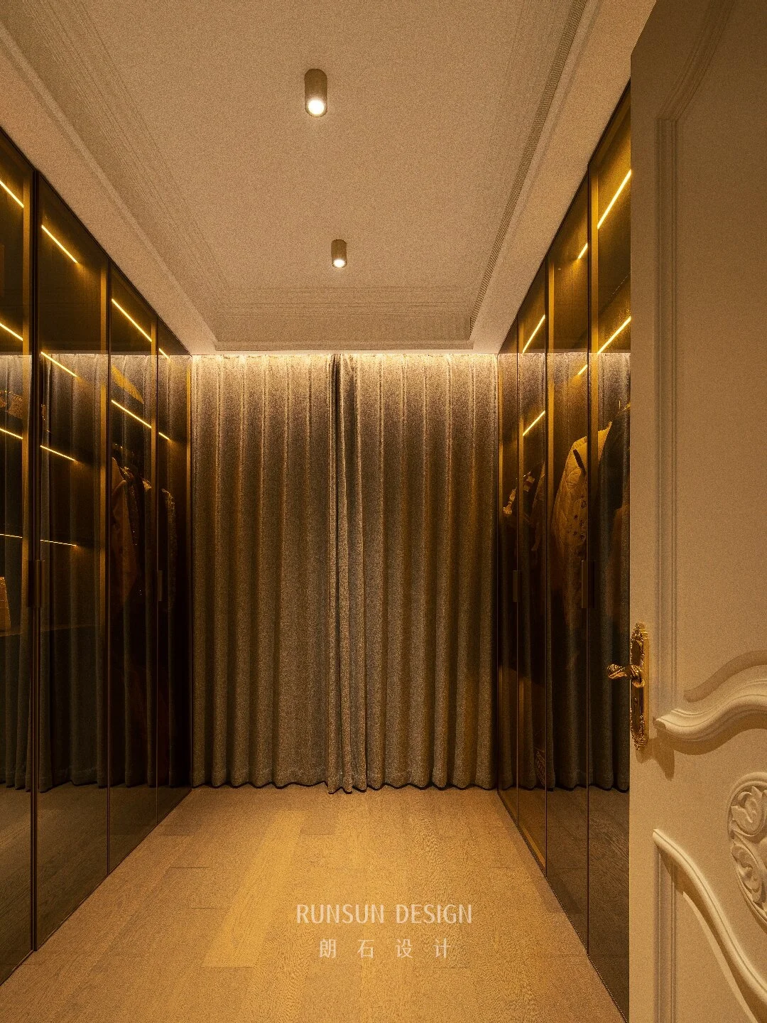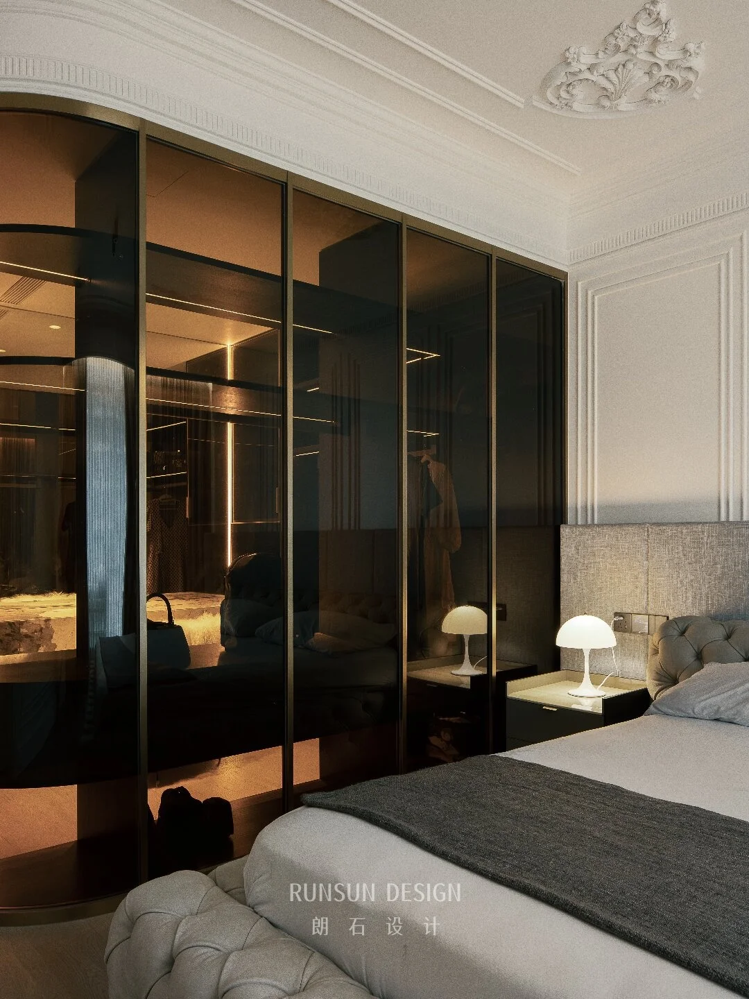 材质的碰撞:黑玻、金属、木饰面、大理石等材质的组合,让空间在精致感与温暖感之间取得了平衡。 光影的层次:暗藏的线性灯、点光源与台灯相互配合,通过明暗变化塑造出丰富的空间层次。 风格的融合:将法式古典的雕花、石膏线等元素,与现代简约的柜体、利落的线条结合,呈现出优雅又不失现代感的独特气质。
