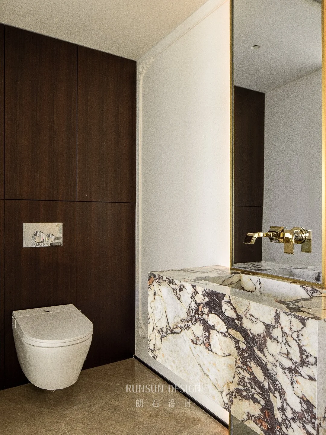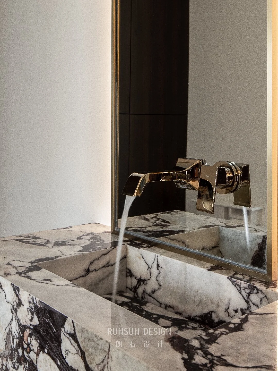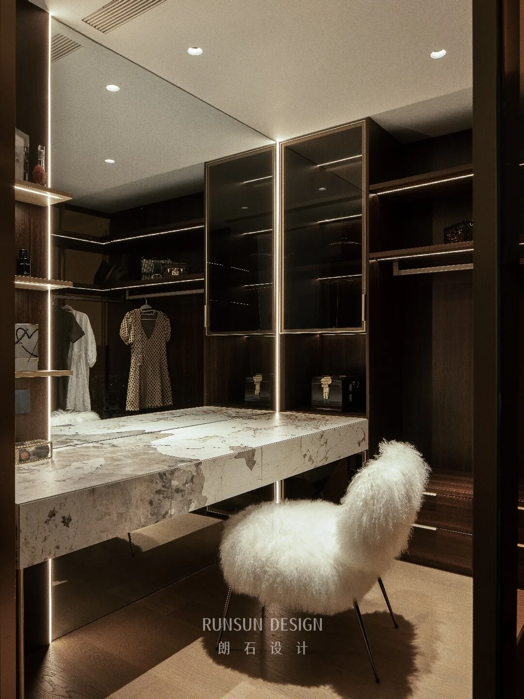 材质的碰撞:黑玻、金属、木饰面、大理石等材质的组合,让空间在精致感与温暖感之间取得了平衡。 光影的层次:暗藏的线性灯、点光源与台灯相互配合,通过明暗变化塑造出丰富的空间层次。 风格的融合:将法式古典的雕花、石膏线等元素,与现代简约的柜体、利落的线条结合,呈现出优雅又不失现代感的独特气质。