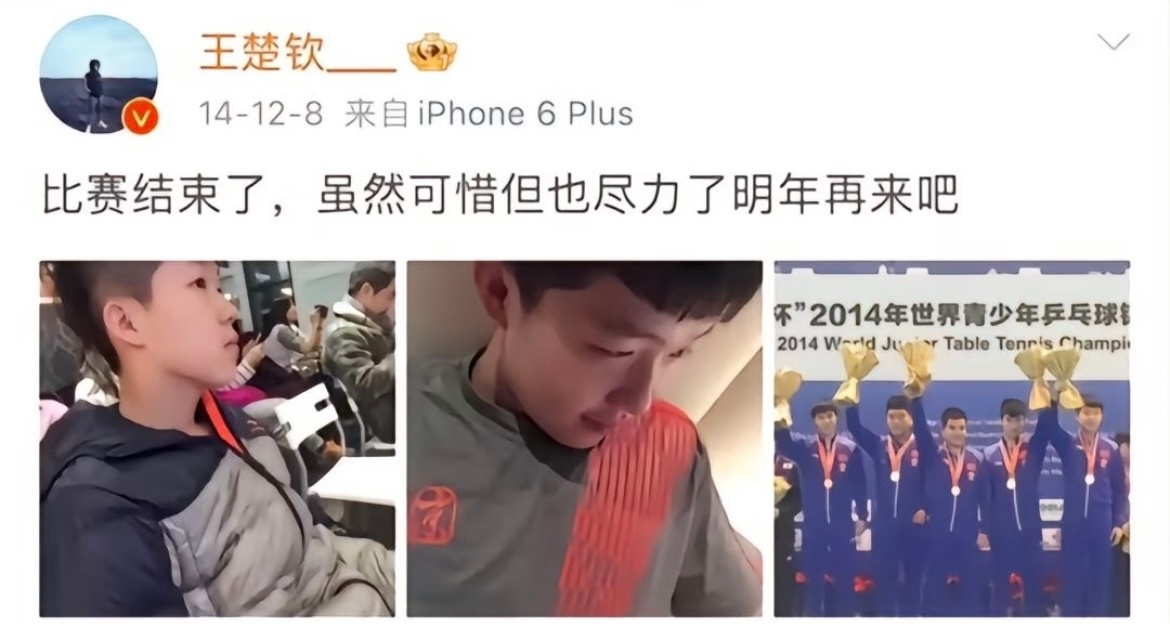 14年世青赛之后发的微博 小孩应该是在可惜男单和男双 男团和混双拿冠军了🏆🏆