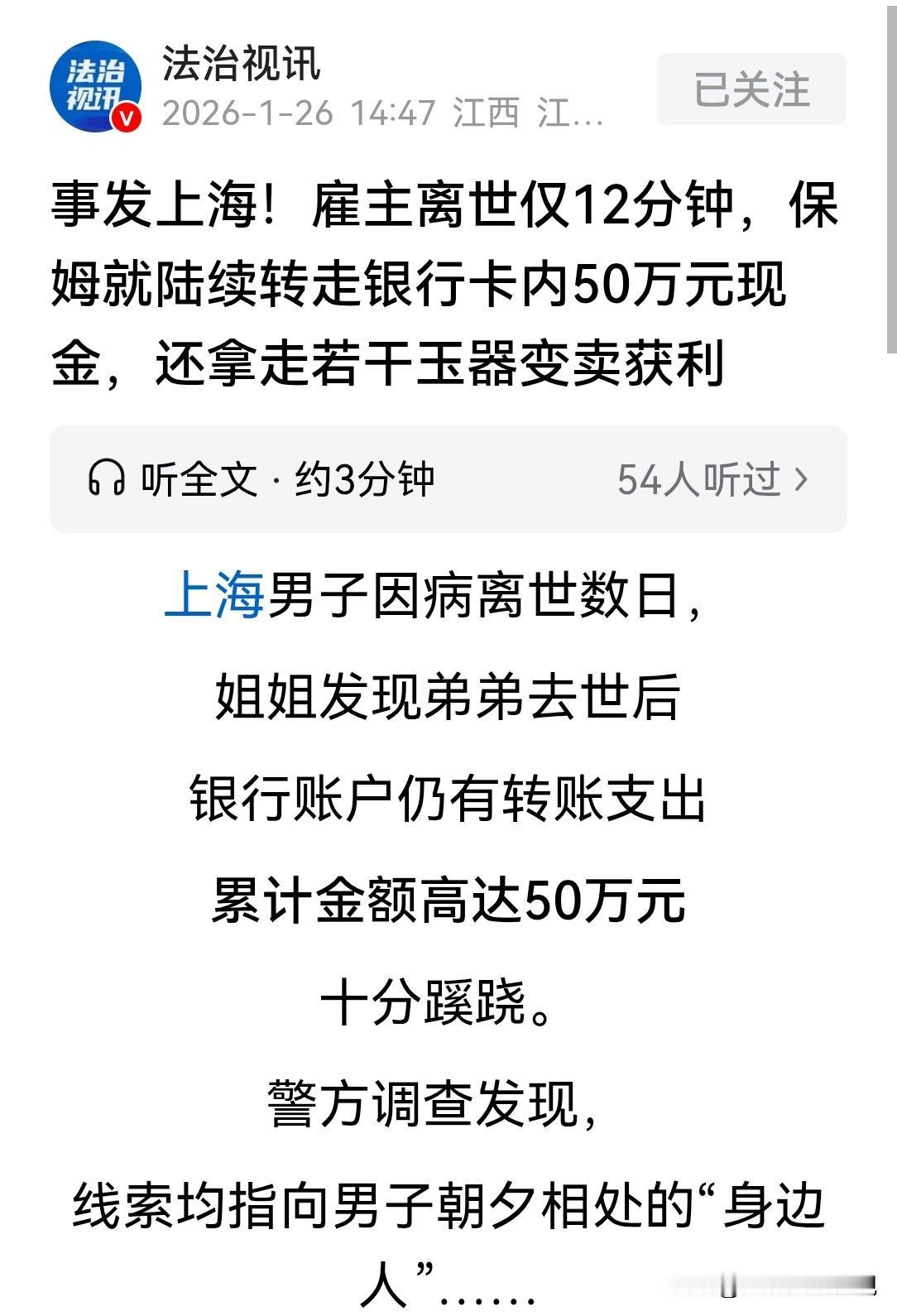 不怕贼偷,就怕贼惦记!上海,男子因病去世,12分钟后,家人发现他的银行账户,被划走了10万元,当天共被转走20万,还被人在取款机中取走1万现金。第二天,账户又转出了29万, 总转出金额高达50万元。而且,男子的两处住房内,多件玉器也不见了。警方介入调查,男子家的保姆进入警方视线…… 张先生和妻子结婚后没有生育子女,夫妻相依相伴,前半生两口子生活的很幸福。 因为没有孩子的牵绊,为了将来的养老考虑,夫妻俩多年来积蓄了不少的财富。 除了存款,张先生平时还喜欢收藏玉器,家里的各种玉石手串,和吊坠也是一笔不小的财富。 不幸的是,张先生的妻子早年就去世了,留下他一个人孤独的生活。 岁月不饶人,张先生的身体大不如以前,他请了住家保姆刘某来照顾自己。 这个女人又勤快又能干,深得张先生信任,在他家一干就是4年。 张先生身体一直不好,2025年12月底,不幸因病离世。 他安静地走了完人生最后一程,因为他没留下遗嘱,身后事由他的家人处理。 可就在张先生离世几天后,他的姐姐张女士,却发现了一件令人匪夷所思的事。 弟弟的银行账户,在他去世后,仍然有资金转出,累计金额高达50元。 这笔钱,对任何一个普通家庭来说都不是小数目。 更蹊跷的是,转账时间,恰好集中在张先生离世后的2天内。 张女士感到事情不对劲,于是赶紧报警求助。 警方接到报案后,迅速展开调查。 经过查询银行交易记录,民警发现,第一笔转账就发生在张先生去世当天,时间点极为接近。 张先生于上午9点33分离世,就在12分钟后,也就是9点45分,他的账户就被转走了10万元。 接下来的时间里,转账一直未停,当天卡内共被转出20万元。 并且当天晚上,有人从取款机中,取走了1万元现金。 第二天,账户再次被转出29万元。 这些交易记录,清晰显示,转账时张先生已经离世,操作者显然另有其人。 随着警方深入调查,所有线索都指向了一个人,那就是照顾张先生家的保姆刘某。 刘某在张先生家中做保姆已有4年时间,家里的日常打理,张先生的饮食起居,都由她负责。 由于长期相处,张先生非常信任刘某,把自己的手机支付密码也告诉了她。 家里的日常开销,刘某直接用张先生的手机操作,银行账户密码她也一清二楚。 这种信任,在张先生生前是便利,可在他离世后,却成了天大的漏洞! 刘某以为张先生已经去世,他又没有妻子儿女,只有一个老娘,岁数已经很大,对儿子家里的经济状况根本不知道。 而张先生唯一的姐姐,虽然平时和他偶有联系,但家里的经济状况,以及银行账户姐姐从来没过问过。 张先生离世后,刘某起了歹念,在第一时间利用自己掌握的银行密码,将张先生账户里的钱取走50多万。 警方联系刘某到公安机关配合调查。 到案后,刘某没敢隐瞒,如实交代了作案经过。 她称,张先生离世后,她知道张先生的家属,短期内不会立即处理家庭财物。 趁此机会,分多次将账户内的资金转走。 在转完50万元后,她并未收手,还跑到张先生的两处住宅,拿走了大量玉器,转手就卖了换钱。 为了避免被家属发现,她甚至试图删除手机中的转账记录,企图让这一切无声无息。 然而,她忽略了一个重要事实,张先生的遗产并非无主之物。 根据法律规定,在死者没有遗嘱的情况下,遗产依法进入法定继承程序。 张先生的母亲就是唯一的第一顺位继承人。 刘某虽然长期照顾张先生,但双方仅是雇佣关系,无任何继承权。 她所转走的钱和拿走的玉器,在法律上,均属于张先生母亲的财产。 刘某的行为,表面上是利用职务之便转移资金,实质上是以非法占有为目的,秘密窃取他人财物,已涉嫌盗窃罪。 《刑法》第264条,盗窃公私财物,数额较大的,或者多次盗窃、入户盗窃、携带凶器盗窃、扒窃的,处3年以下有期徒刑、拘役或者管制,并处或者单处罚金; 数额巨大或者有其他严重情节的,处3年以上10年以下有期徒刑,并处罚金; 数额特别巨大或者有其他特别严重情节的,处10年以上有期徒刑或者无期徒刑,并处罚金或者没收财产。 “盗窃公私财物”就是指未经财物主人同意,拿走属于他人的财产。 “数额较大”、“多次盗窃”等是判断是否构成犯罪,以及量刑轻重的关键要素。 保姆刘某在张先生去世后,明知自己无继承权,却利用掌握的密码。 将张先生银行账户内的50多万元转走,还拿走其家中玉器变卖。 涉案金额高达50多万元属于数额特别巨大。 目前,警方已追回被转走的资金,以及变卖玉器所得的钱,总计价值近百万元。 刘某因涉嫌盗窃罪,已被刑事拘留,等待她的将是法律的审判! 这起事件也提醒众人,像张先生种情况,提前订立遗嘱很有必要,将家中的财务情况做好安排。 避免向保姆这样的非家庭成员,完全交托支付权限。 对此你怎么看? 关注@赵哥的法律观,明辨是非不上当。