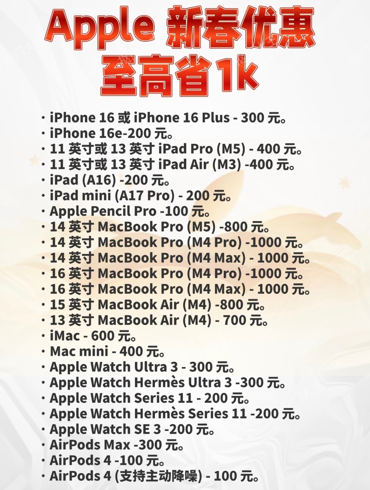 苹果多款产品限时促销这次参与此次活动的产品涵盖了苹果主要产品线。iPhone 16 / 16 Plus:立减300元iPhone 16e:立减200元最新发布的iPhone 17系列、iPhone Air不参与本次优惠。Mac14/16英寸 MacBook Pro(M4 Pro/Max):立减1000元14英寸 MacBook Pro(M5):立减800元15英寸 MacBook Air(M4):立减800元13英寸 MacBook Air(M4):立减700元Mac mini:立减400元;iMac:立减600元iPadiPad Pro M5 / iPad Air M3:全系立减400元iPad A16 / iPad mini A17 Pro:立减200元Apple WatchApple Watch Ultra 3:立减300元Series 11 / SE 3:立减200元AirPods & 配件AirPods Max:立减300元AirPods 4(含降噪款):立减100元Apple Pencil Pro:立减100元不过注意了,此次有限购,每个人只能限购2部!