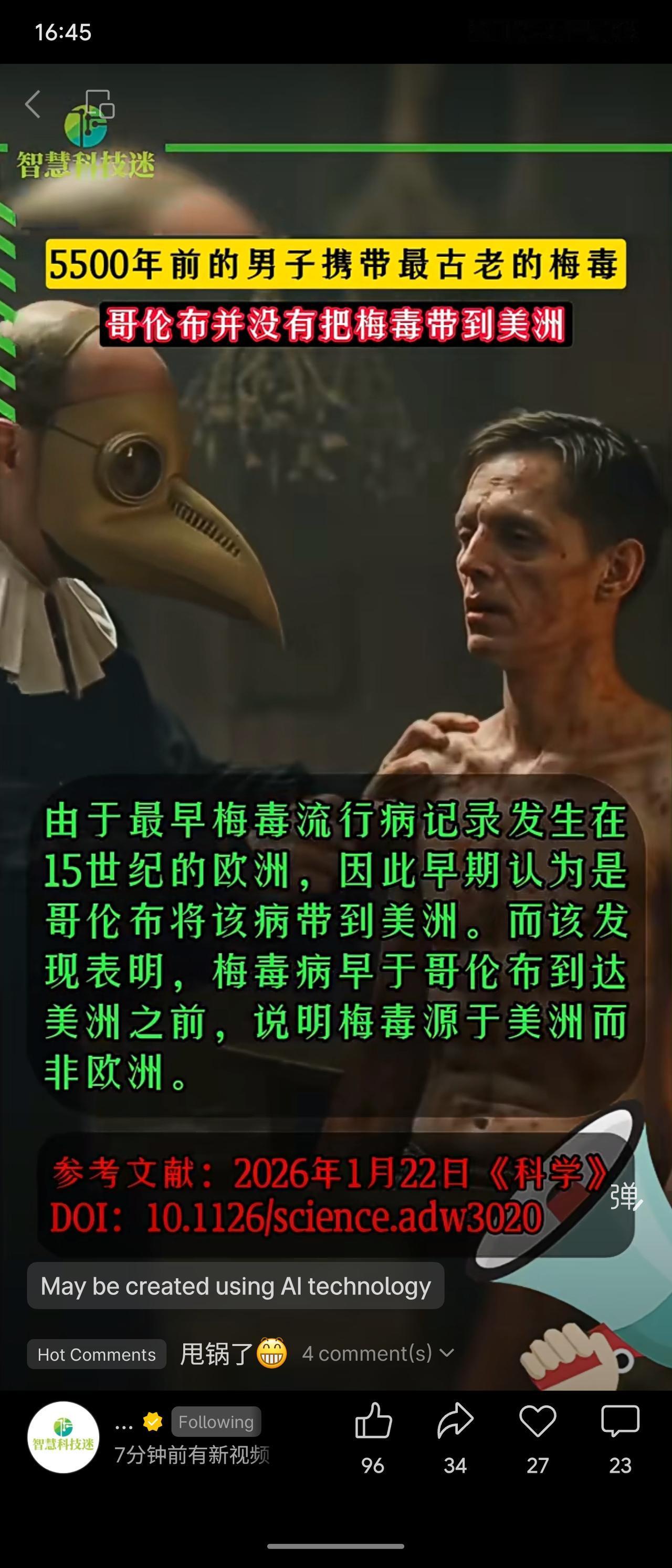 美国科学家对哥伦比亚5500年前男性遗骸的DNA分析发现,其携带未知梅毒螺旋体,推测该病原体早在约13700年前就已存在。这一发现表明梅毒在哥伦布抵达美洲之前便已出现,支持了梅毒源于美洲而非由哥伦布传入的观点,改写了该疾病的起源认知。