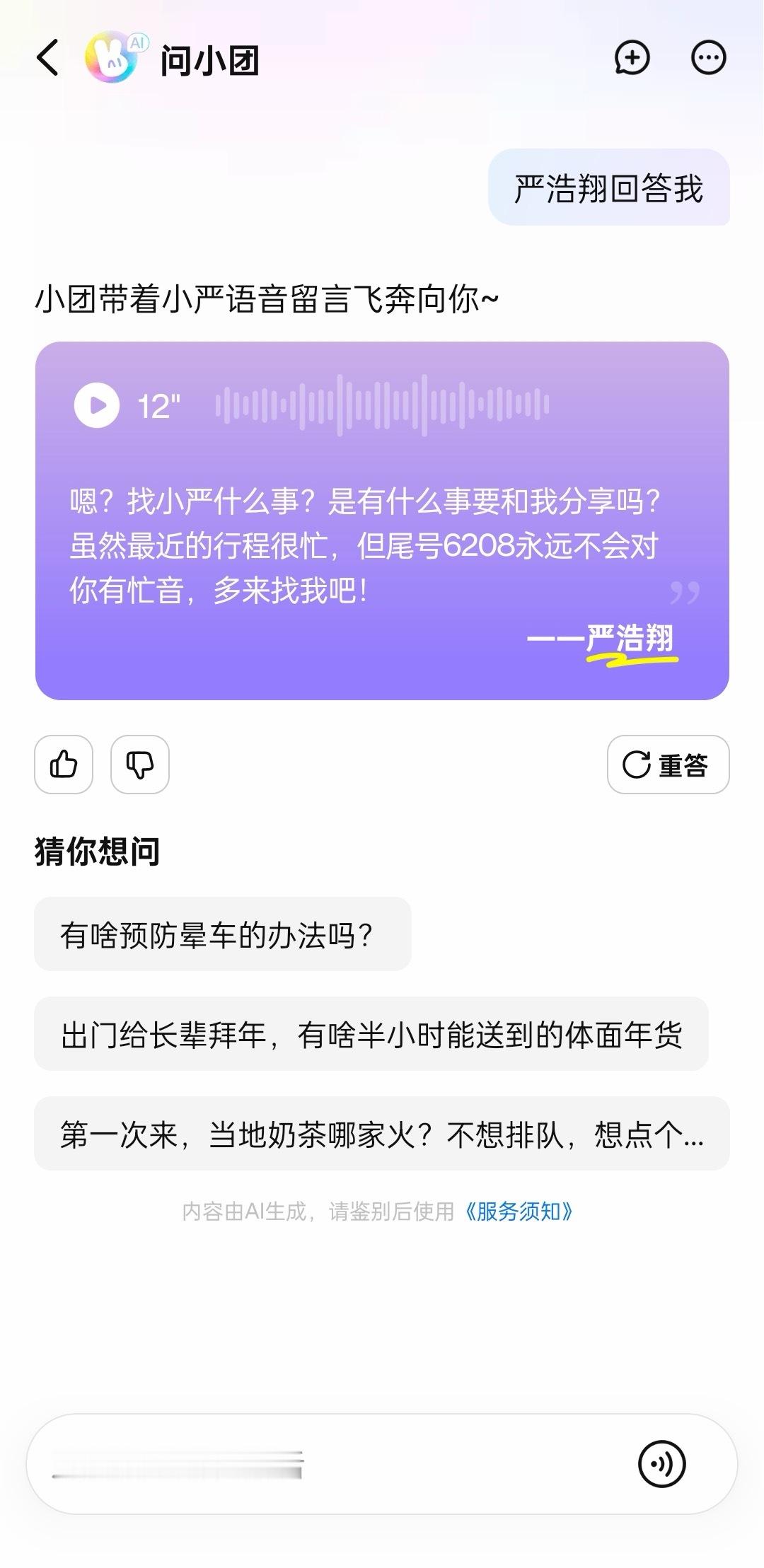 时团粉丝速来!去美团AI搜索问小团,输入时代少年团或成员姓名+回答我,就能解锁独家语音彩蛋,暖心祝福、趣味整活全都有,团体语音超治愈。美团AI搜索是全能生活助理,啥问题都能问! 有点跟不上时代少年团的网速了 ⽣活问题问美团都安排 美团上线AI搜索时团真不把我们当外人