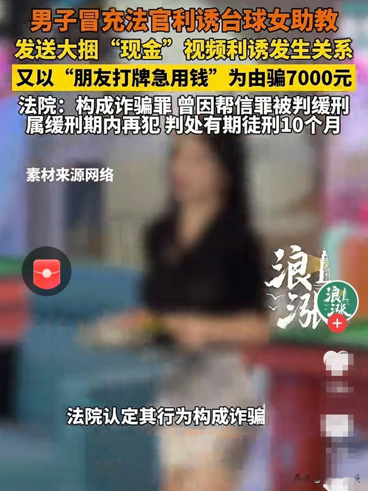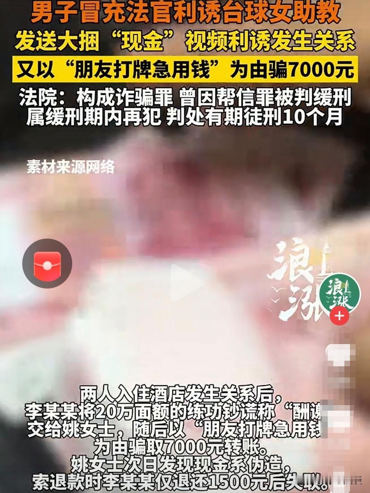 湖北,一男子自称是公职人员,约台球厅女助教见面。开门见山直接开条件,陪玩给15万,去酒店开房给10万。女助教见钱眼开,直接跟着去了酒店。完事后,男子给了她20万现金,临走说要去打牌没带钱,向女助教借了7000元。等男子走了,女助教打开钱一核对,当场傻了,全是没用的练功券,女助教找男子要钱,男子给转了1500元后,直接失联,女子愤怒报警。 2025年3月,台球厅的姚女士,在会员群里认识男子李某。 李某一上来就吹得天花乱坠,说自己是公职人员,手里有资源、不差钱。 没聊两句就直奔主题,给姚女士开了个让人眼红心热的条件。 由于身份原因,不方便到公开场合见面,如果陪我出去散散心,给你15万。要是愿意跟我去酒店,直接给10万! 姚女士一听这话,眼睛都亮了,虽然每天接触的人都非富即贵,但这么大方的主真没遇到过。 她当场就动了心,二话不说跟着李某去了酒店。 开房时李某让姚女士去办手续,说自己是公职人员不方便,姚女士一听有道理。 完事之后,李某果然大气,当场甩给姚女士一厚沓现金,拍着胸脯说:“这里是20万,多给你的,拿着花! 姚女士看着鼓鼓囊囊的钱袋子,笑得合不拢嘴。 可没等她把钱捂热,李某皱着眉开口了,等会儿要去跟朋友打牌,身上没带够零钱,你先借我7000块周转一下,回头一起还你。 姚女士这会儿正被20万现金冲昏头,人家不差钱,可能是考验她是否小气。 这样的主不好碰,可不能让男子小看自己,想都没想就把钱借出去了,李某乐呵呵地走了。 等李某一走,姚女士赶紧把那20万现金拿出来核对,这一看可直接傻了眼。 哪是什么20万,全是一文不值的练功券,一张能花的都没有。 她赶紧联系李某要钱,李某磨磨蹭蹭转了1500块之后,就彻底失联了,电话不接、消息不回。 姚女士这才反应过来自己被骗了,又气又急,当即报了警。 警方一查,李某哪儿是什么公职人员,就是个彻头彻尾的骗子。更让人意外的是,这李某还是个“惯犯”。 2024年6月,他就因为帮助信息网络犯罪活动罪被判了6个月有期徒刑,还缓了一年。 这次骗姚女士,刚好在缓刑考验期内,属于再犯新罪。 《刑法》第266条的规定,只要诈骗公私财物的数额达到3000元到1万元以上,就够得上诈骗罪的标准,得依法追究刑事责任。 李某故意冒充公职人员,虚构身份,还借着“借钱打牌”的由头忽悠姚女士。 姚女士被他的假身份和之前的“20万现金”骗得晕头转向,在错误的认知下把7000元借给了他。 而这7000元已经满足了诈骗罪“数额较大”的要求,所以李某的行为妥妥构成了诈骗罪。 本来诈骗罪的处罚就不轻,再加上他缓刑期内顶风作案,法院直接撤销了之前的缓刑,决定数罪并罚。 最后审理下来,李某被判了10个月有期徒刑,也算是为自己的荒唐行为付出了代价。 说到底,天上哪儿有掉馅饼的事儿?15万、10万的诱惑看着诱人,背后藏的说不定就是坑。 姚女士贪了小便宜,最后不仅没拿到钱,还倒贴7000块,只能怪自己太糊涂。 而李某心存侥幸,以为能蒙混过关,结果把自己送进了看守所,真是得不偿失! @静心法谈 学法辨是非,慬法不吃亏。